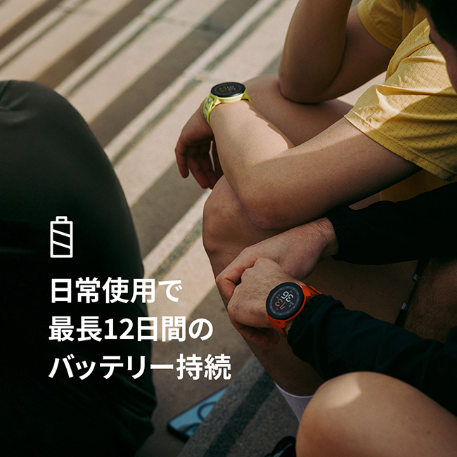 ■バッテリー駆動時間:日常使用(スマートウォッチモード) 最大12日間、トレーニング(パフォーマンスモード) 最大20時間