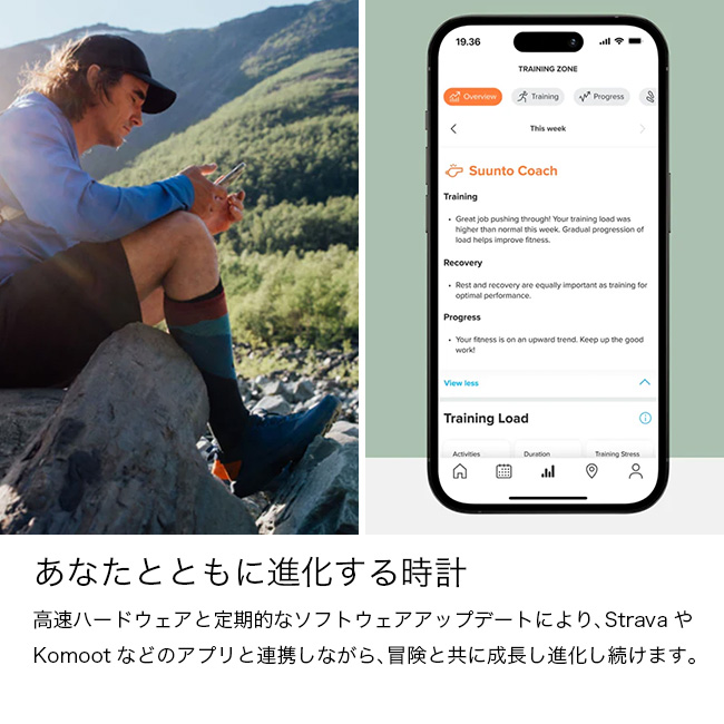 アップグレードされたOHRセンサーが心拍や血中酸素、睡眠のデータをより精密にモニタリングし、Suunto Coach機能がトレーニングの進捗を分析。