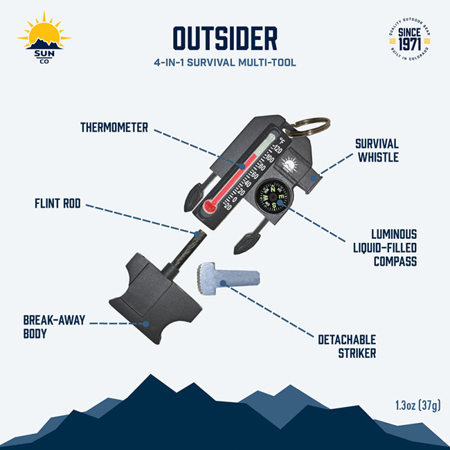 サンカンパニー アウトサイダー4in1 サバイバルツール SUN COMPANY 11500036000000 温度計 コンパス ホイッスル ファイヤースターター 方位磁石 コンパス 地図読み 読図 温度計 笛 火起こし キーホルダー 小物 登山 ハイキング フェス おしゃれ キャンプ アウトドア