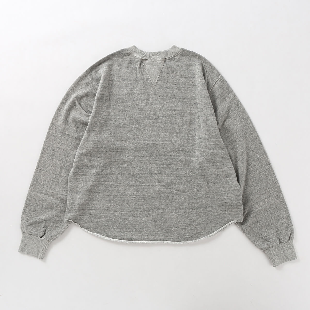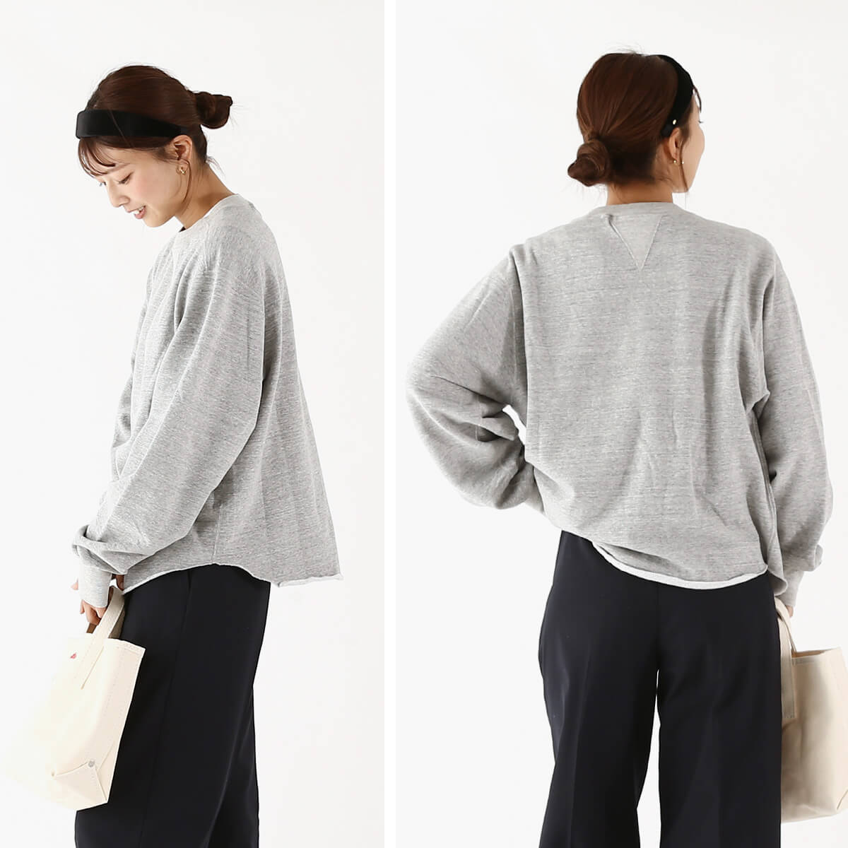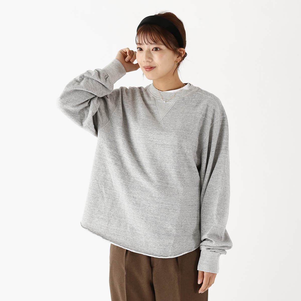 ボトムインできるスウェットを作りたくて、薄手の生地からオリジナルで作ったガゼットスウェット。インすることを前提に作っているので、裾にはリブをつけず、ボトムの中で生地がゴロつくのを軽減しています。