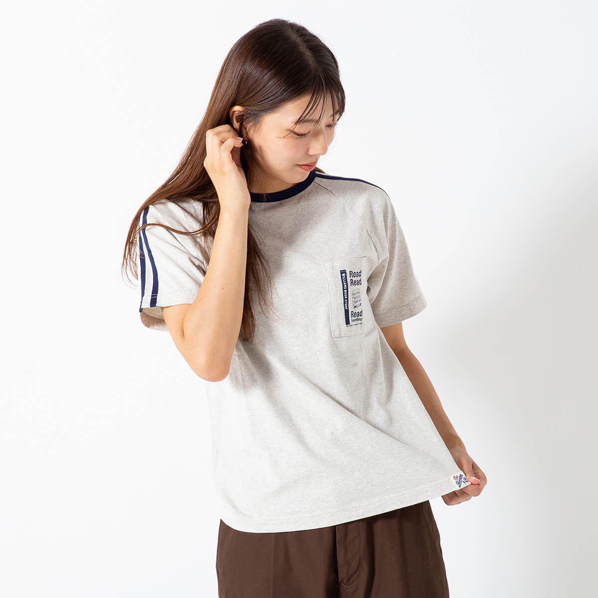 ボディに26/1の糸を使用した、コットン100%の度詰天竺生地を使用。胸元のポケットに、本屋の栞をイメージしたグラフィックを落とし込みました。