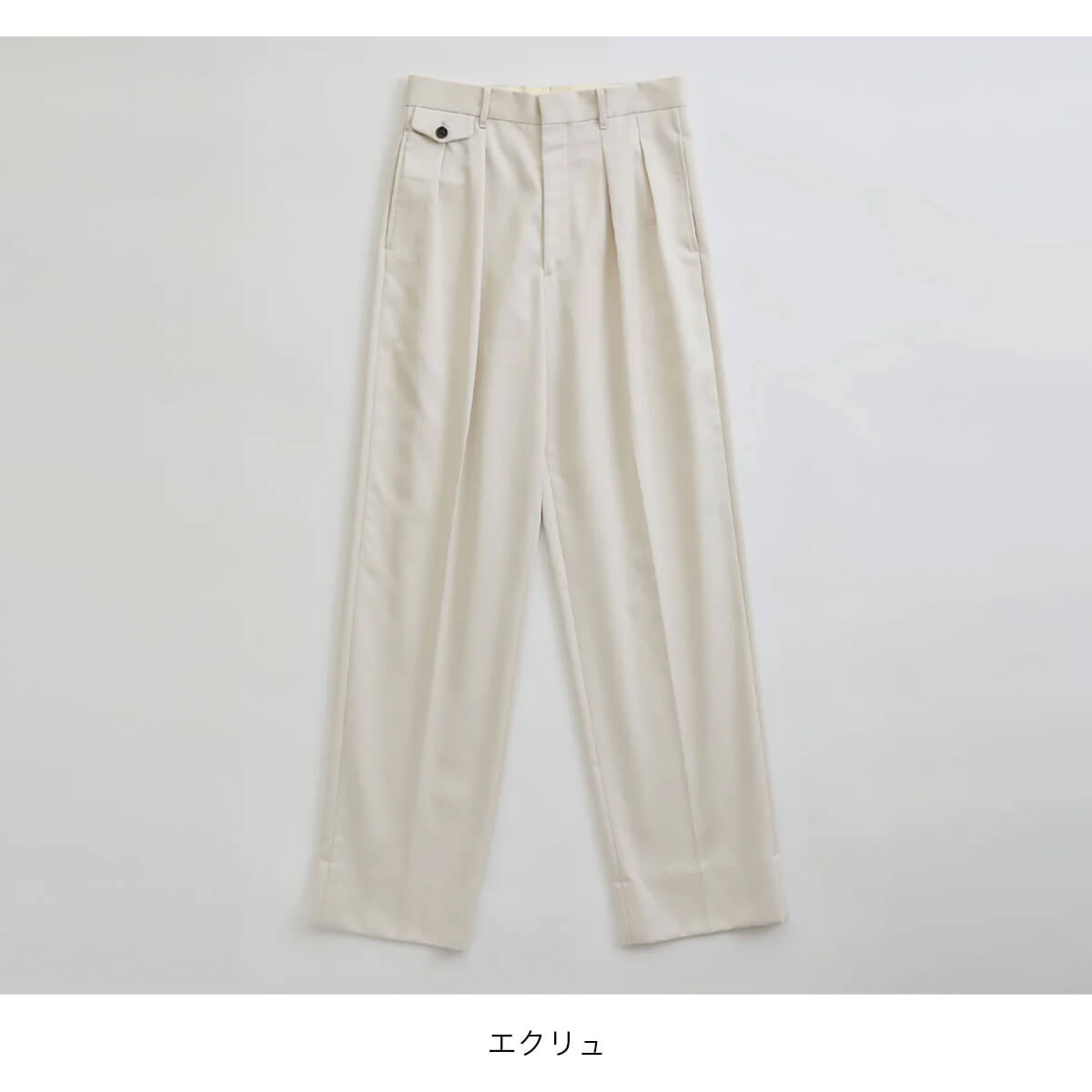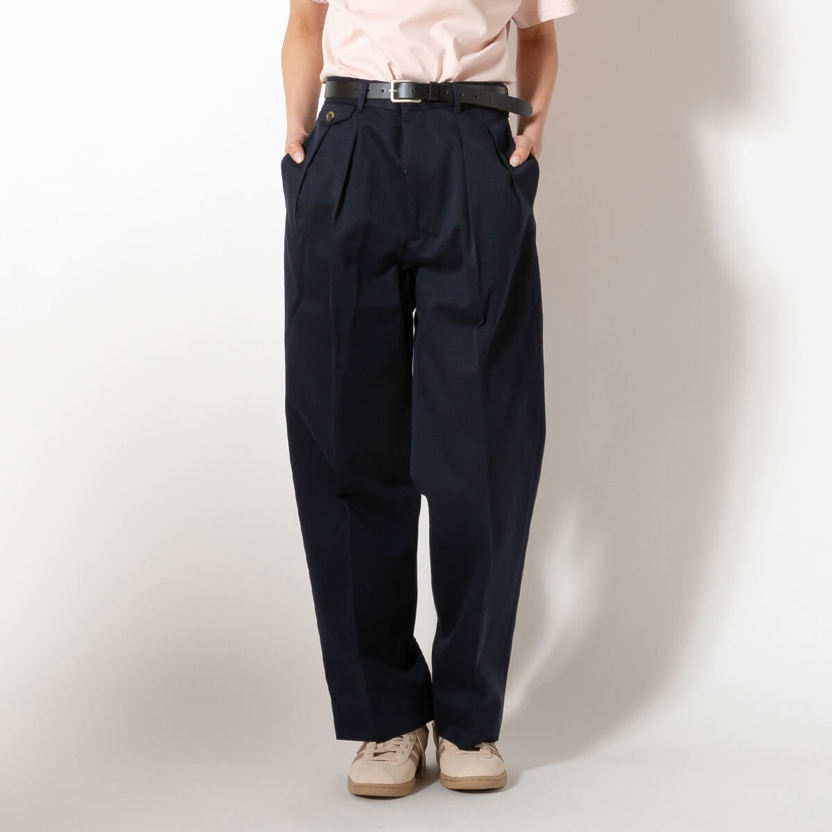 テーパードの股上深めのセンタープレス仕様のため腰でゆったりと、もしく、ベルトでウエストを絞ってジャストで履いても○。
