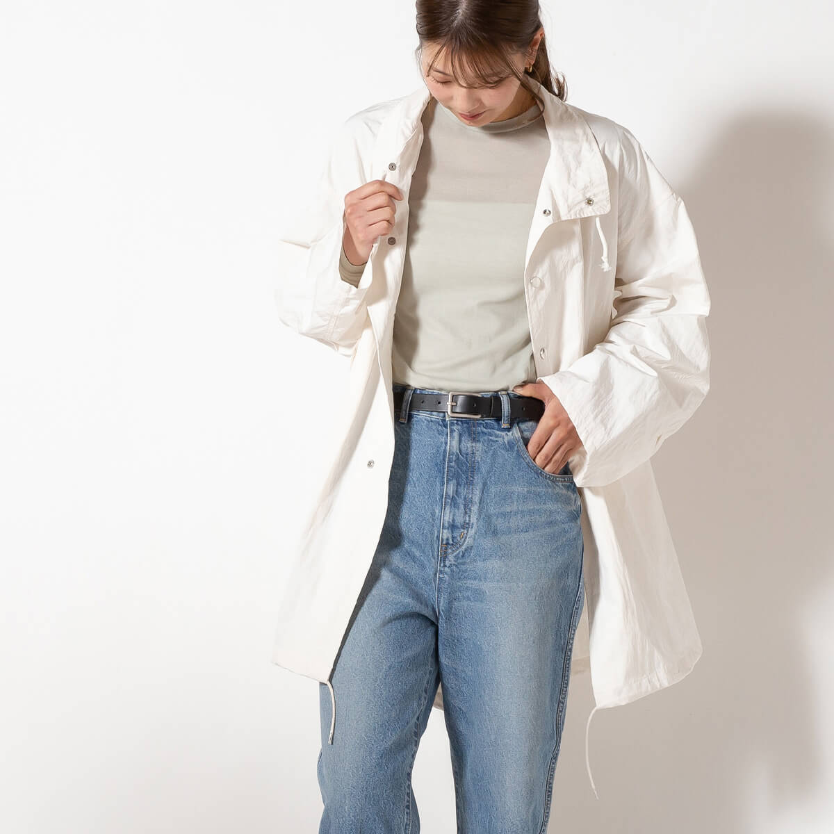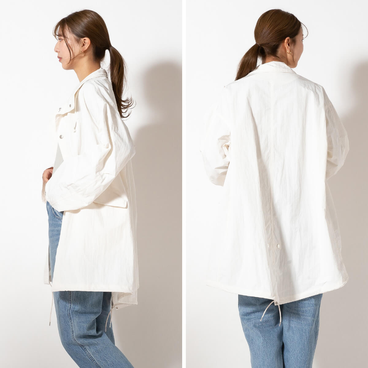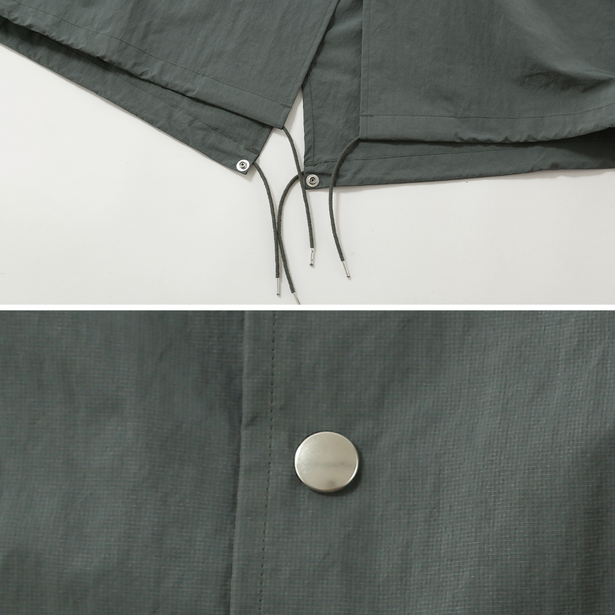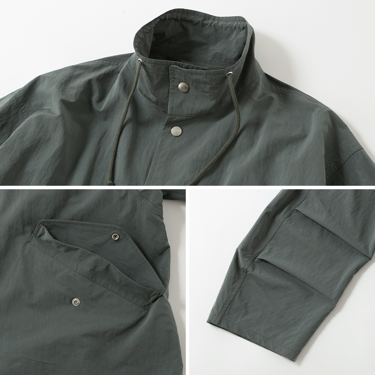 ポリエステルとナイロンをアルカリ処理することによって、ふくらみ感やしなやかさを感じさせる生地に進化させています。ミリタリーの要素をデザインに取り入れながら、同時に素材感でスポーティなムードもプラスしました。