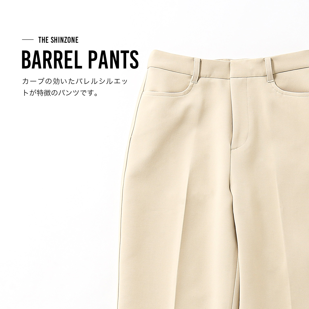 カーブの効いたバレルシルエットが特徴のパンツ