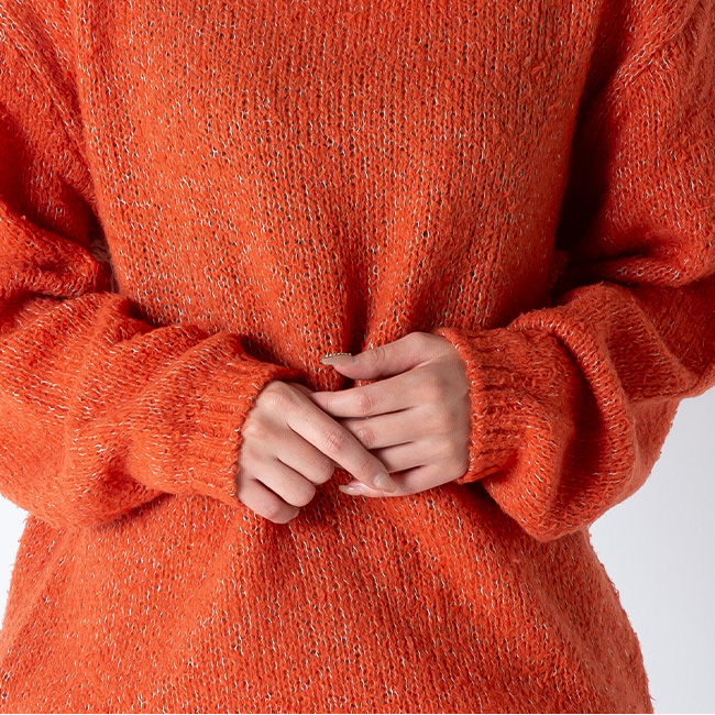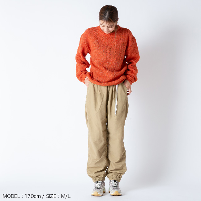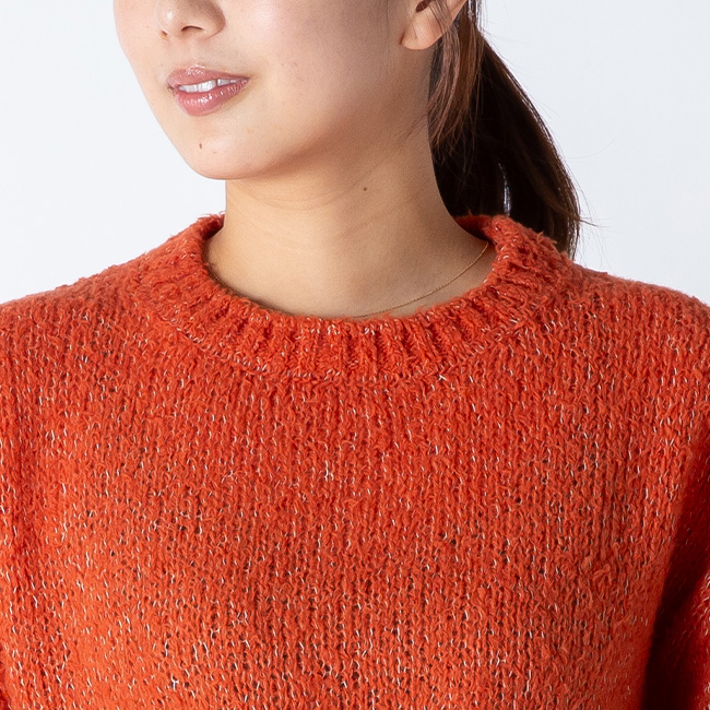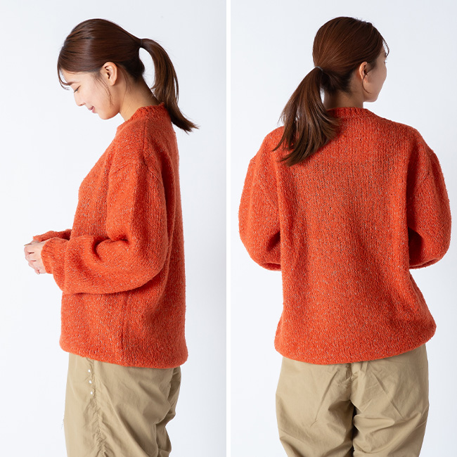 ウール糸には毛足が短く、膨らみと嵩高さに優れたフレンチメリノ主のウールを使用し、暖かさ、軽さ、熱抜け感のバランスを意識した粗めのニットに仕上げています。