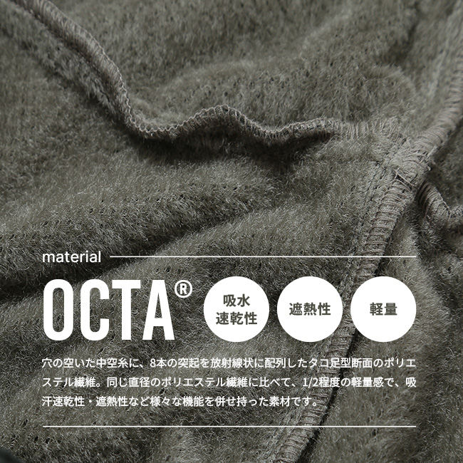 全面Octa®CPCP®をライニングしたリラックスウェアです。Octaの優れた通気性と吸湿発散性により、肌に心地よい着用感をもたらします。