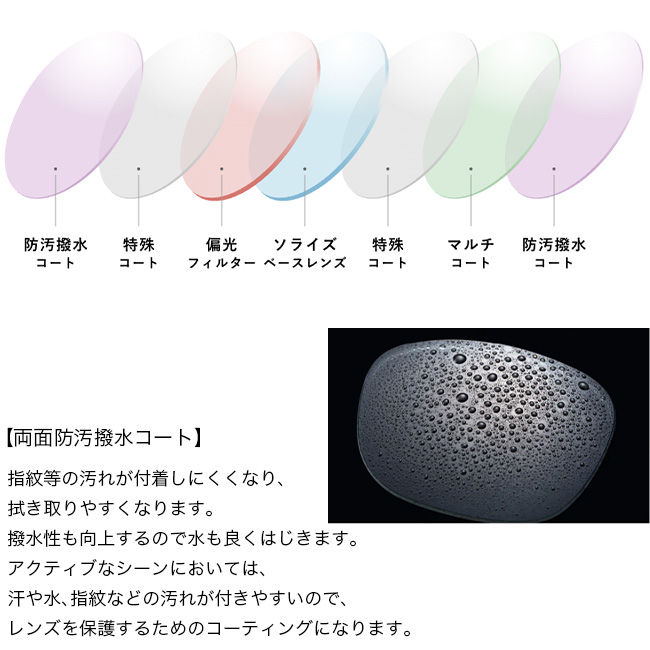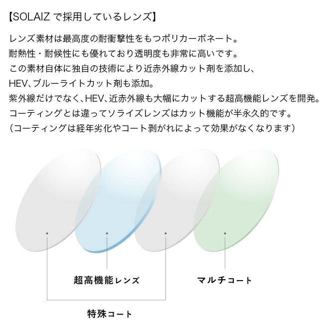 レンズ/プラスチック(ポリカーボネイト、耐傷性特殊コート、裏面マルチコート)