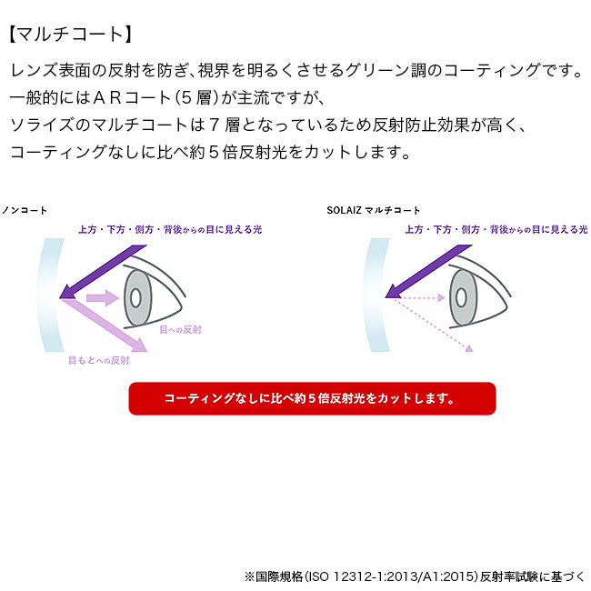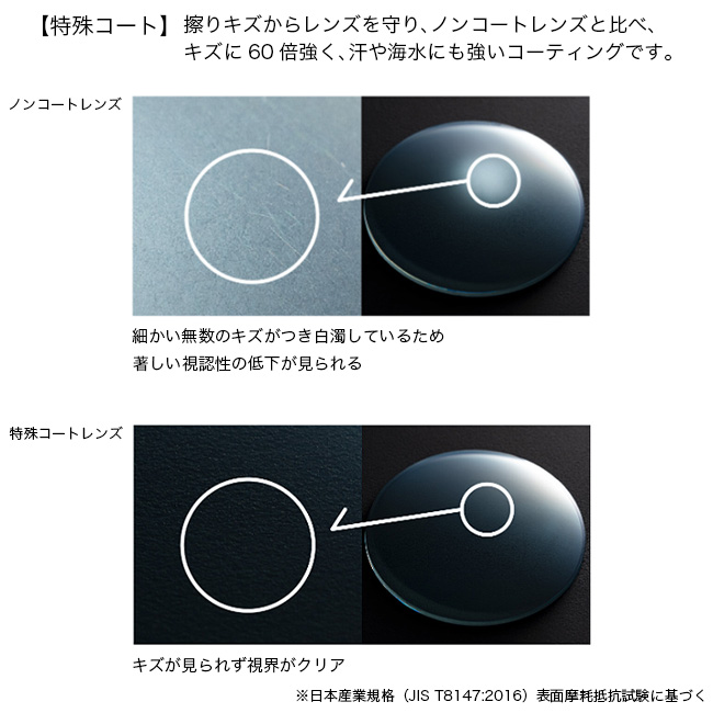 レンズ/プラスチック(ポリカーボネイト、耐傷性特殊コート、裏面マルチコート)