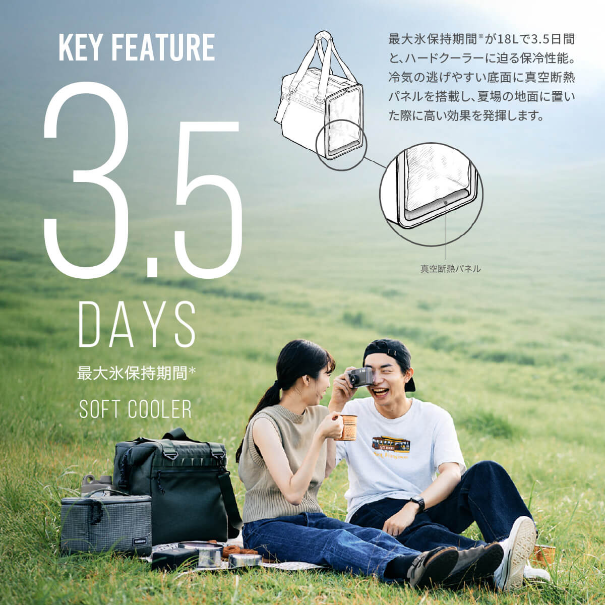 釣り場という厳しい環境で鍛え上げてきたシマノのクーラーボックスから、ソフトクーラーが登場。最大氷保持期間※が18Lで3.5日間と、ハードクーラーの3面真空モデルに迫る保冷性能。