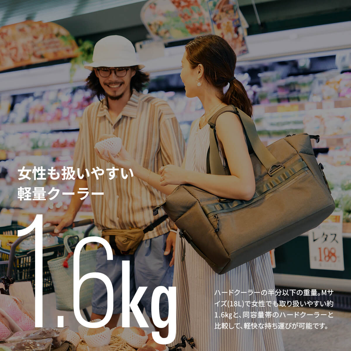 重量はMサイズ(18L)で女性でも取り扱いやすい約1.6kgと、同容量帯のハードクーラーと比較して半分以下の重量で、軽快な持ち運びが可能です。