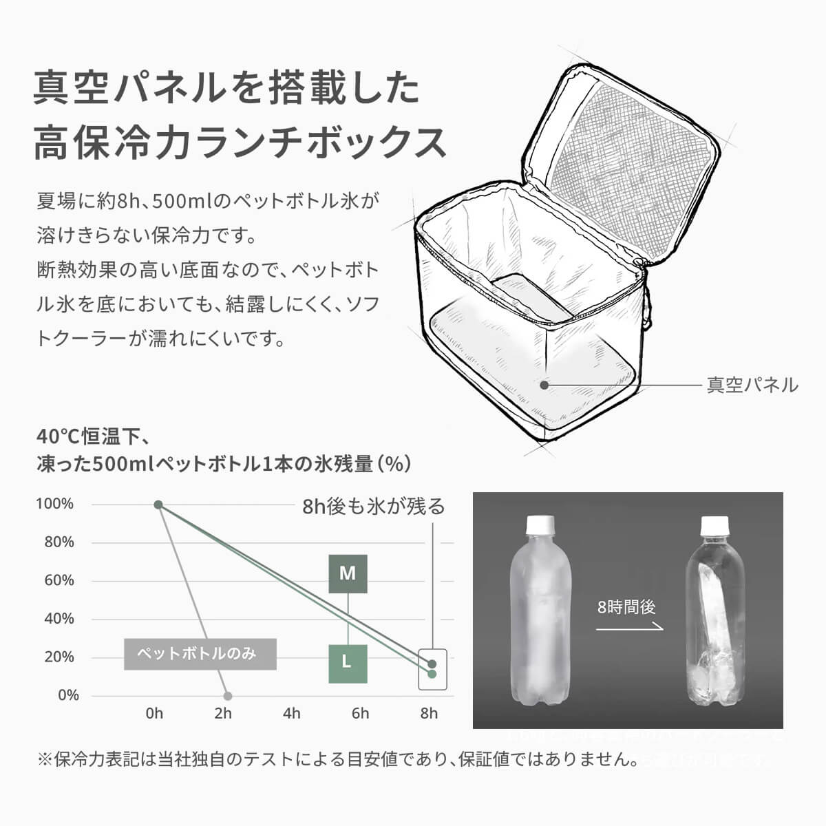 真空パネルを搭載した高保冷力ランチボックスが登場しました。ペットボトル氷を1個入れるだけで、夏場でも8時間保冷力を保持。