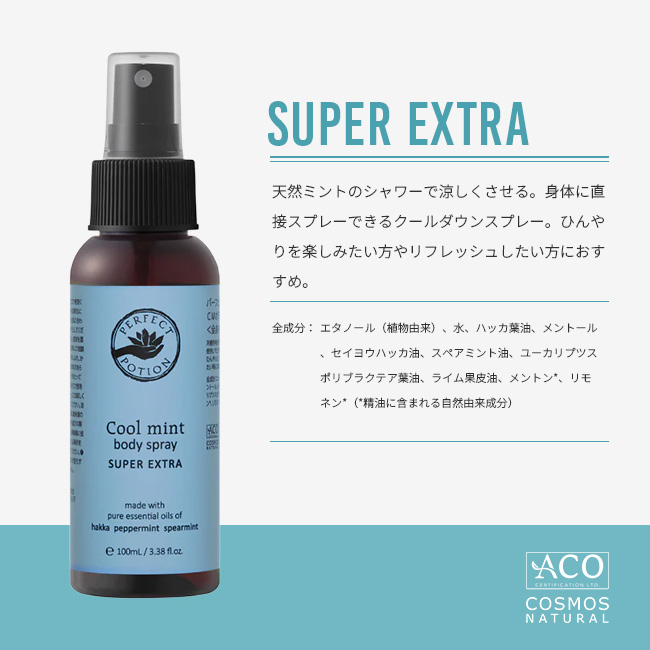 パーフェクトポーション クールミントボディスプレースーパーエクストラ100ml PERFECT POTION 112001CB ミント 冷感 アロマスプレー ボディケアスプレー 天然成分 ハーブ フレッシュ 肌 衣料 ギフト プレゼント 贈り物 キャンプ アウトドア