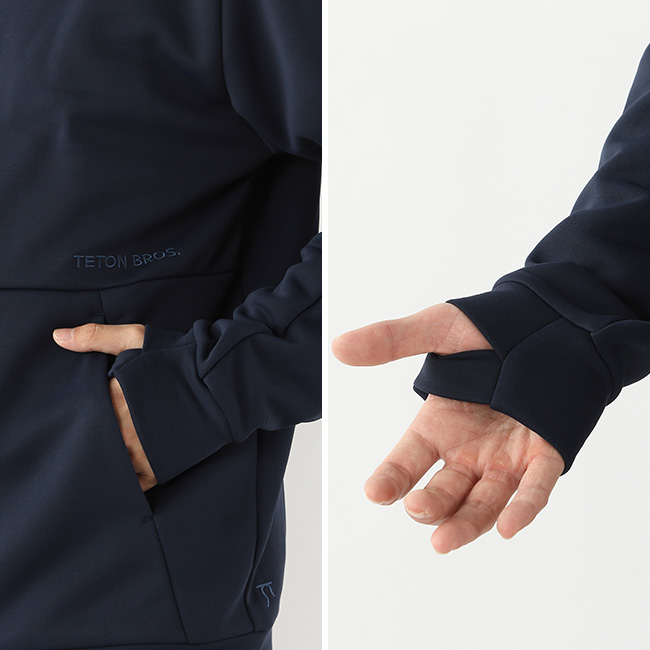 両サイドに手を入れやすいポケットとサムホールを備えています。
