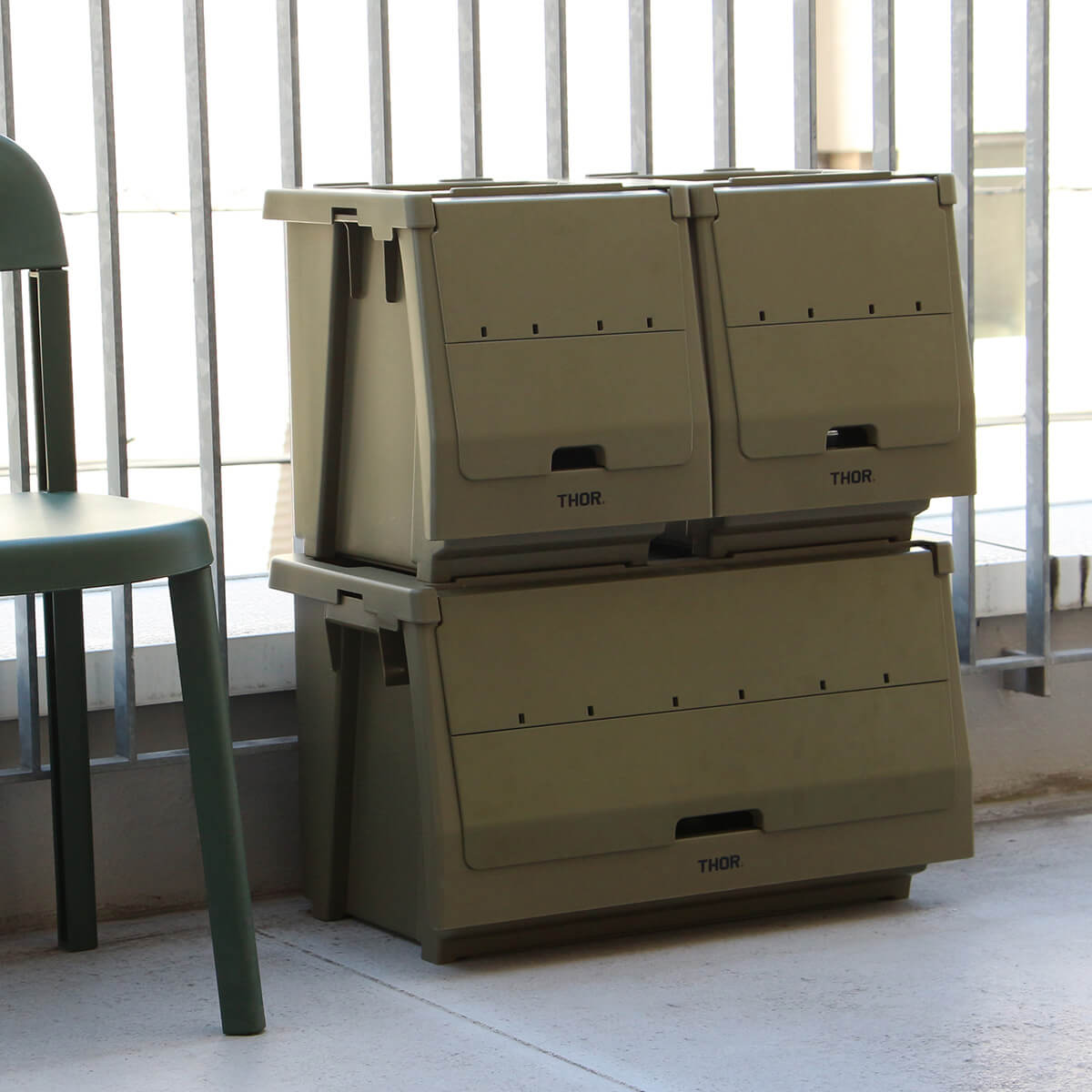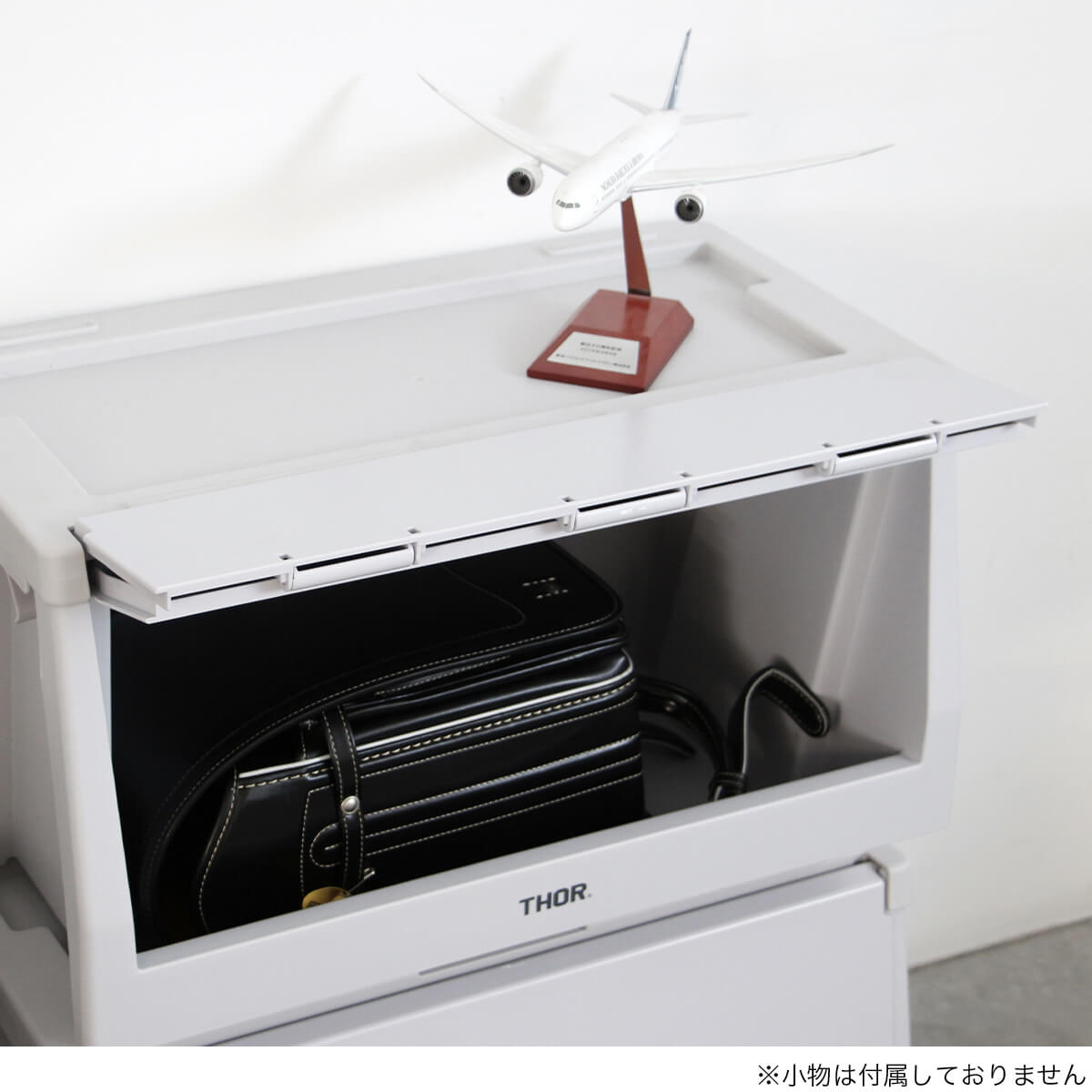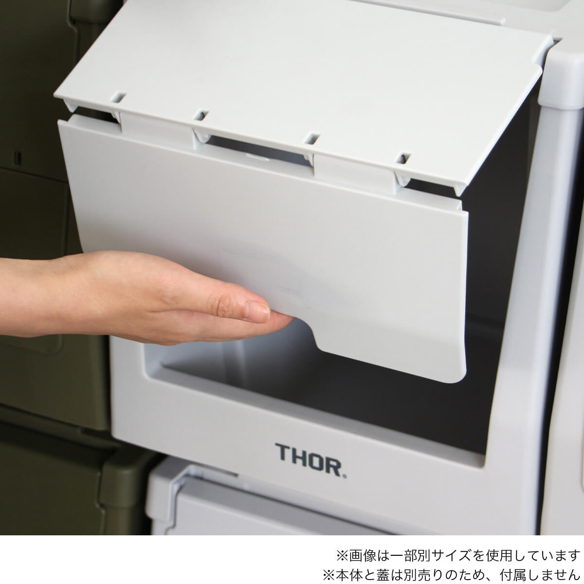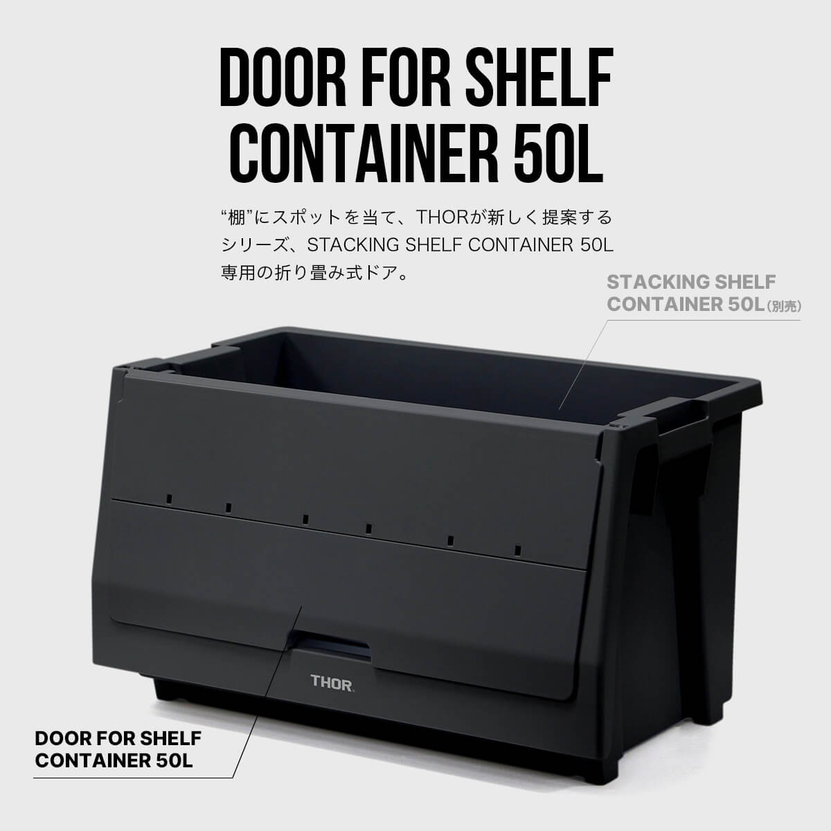 “棚”にスポットを当て、THORが新しく提案するSTACKING SHELF CONTAINERシリーズの50L専用の扉パーツ。ドアは片手で開閉でき、本体内部にはストッパーがあるので開けた状態で固定が可能です。