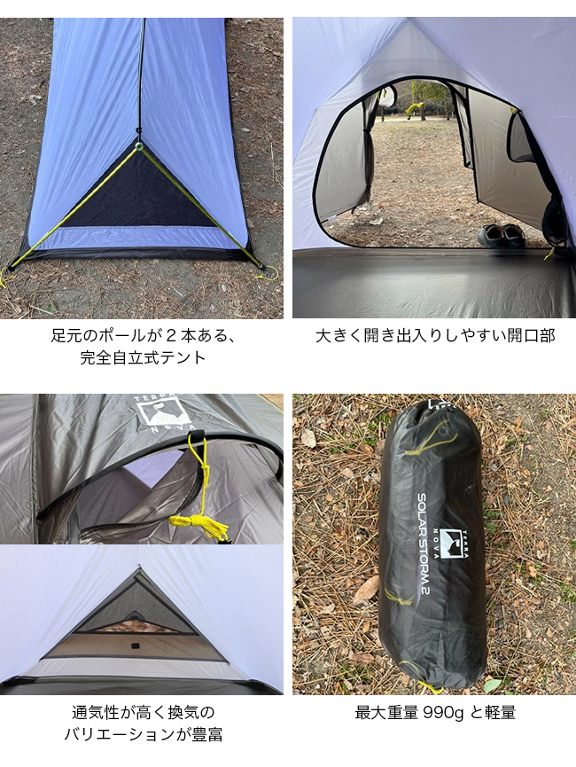 テラノヴァ売れ筋NO.1のソーラーフォトン2の完全自立バージョンで足元のポールが1本から2本へ。フライシートは地面に近く雨天時に雨の侵入を防ぎ通気性が高く換気のバリエーションが豊富です。