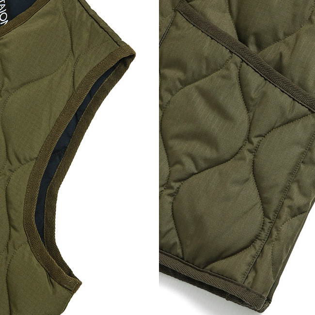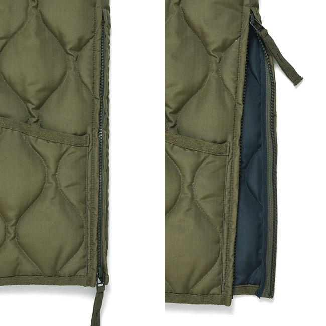 丈夫なリップストップ生地を使用し、保温性に優れた800FPのダウンを採用。ヘチマキルトのダウンステッチが、ミリタリー感を演出。