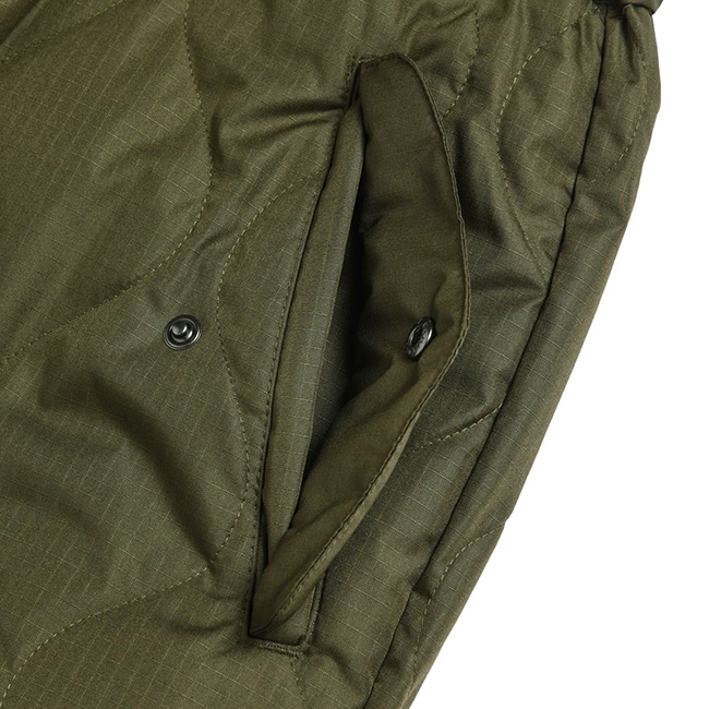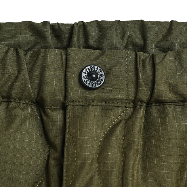 保温性抜群、金属ボタン使いがアクセント、ミリタリーパラシュートダウンパンツ