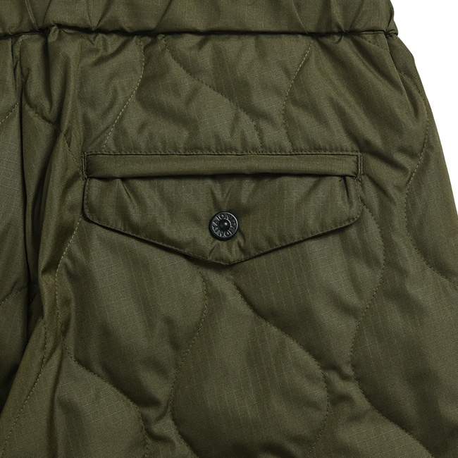 金属ボタン使いがアクセント、裾にかけてすっきりしたシルエットのパラシュートダウンパンツ。丈夫なリップストップ生地を使用し、保温性に優れた800FPのダウンを採用、ヘチマキルトのダウンステッチでミリタリー感を演出。
