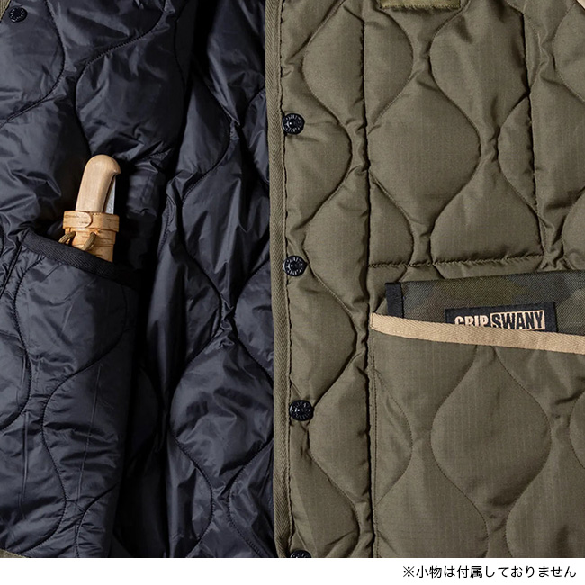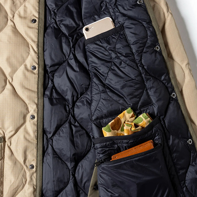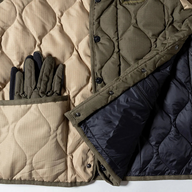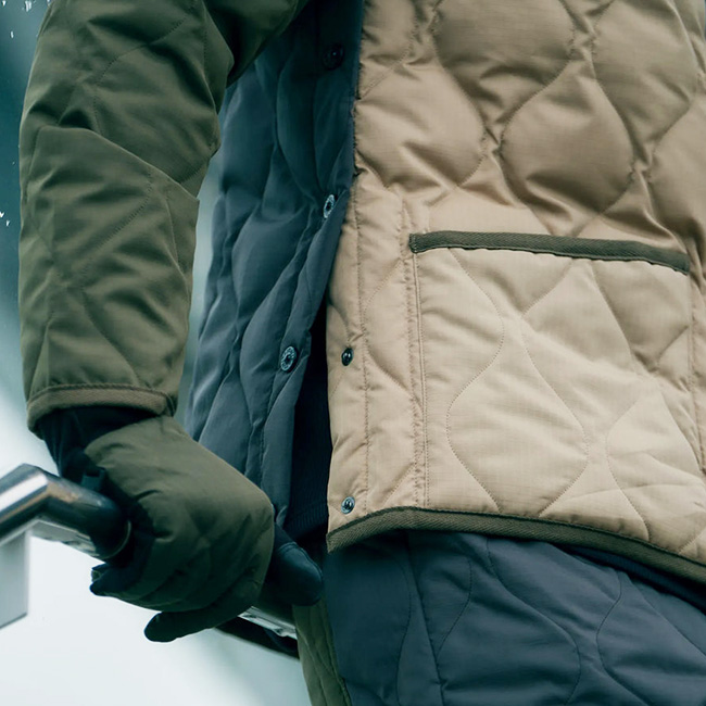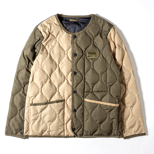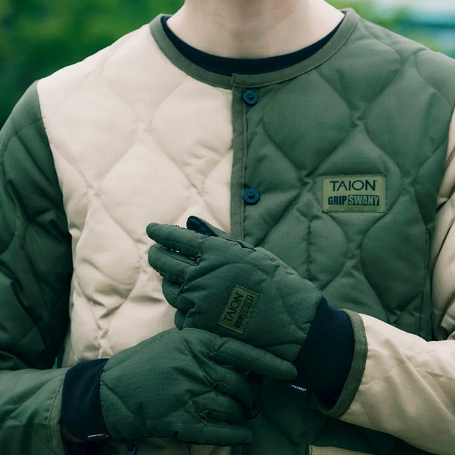 表面はTAIONのミリタリーダウンジャケットをベースに、裏面はGRIP SWANYならではの多機能ポケットを備えたアウトドア仕様。リバーシブルで用途によって着回しが可能です。