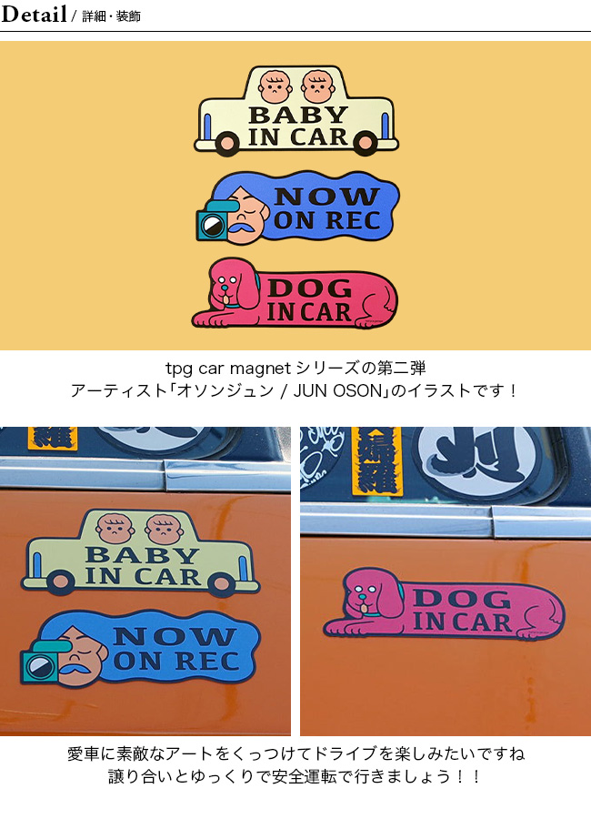 テンプラサイクル×ジュンオソン テンプラガレージ カーマグネット tempra cycle×JUN OSON オソンジュン BABY IN CAR ベビーインカー DOG IN CAR ドッグインカー NOW ON REC ナウオンレック ドラレコ 車マグネット キャンプ アウトドア フェス