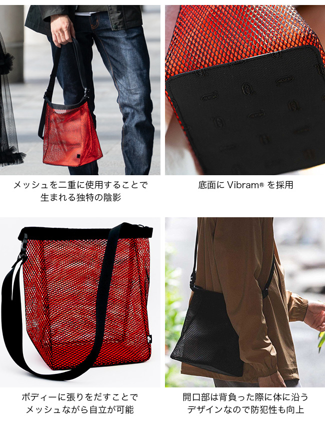 本来は粒子の細かいチョークを入れるものですが、UNITIUM.では「メッシュ」を重ね合わせた(Overlap)独自の構造で、ライフスタイルで活躍するプロダクトにモディファイしました。ボトム部分にはVibram®を採用し、メッシュ素材ながら置き場所の状況を気にせずにご使用いただけます。
