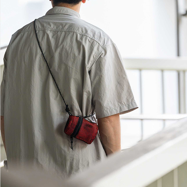ダブルメッシュを用いることで、クッション性のある、他に類の見ないデザインの収納ケースとなりました。背中と蓋を一体化させるこだわった構造にも手間をかけています。