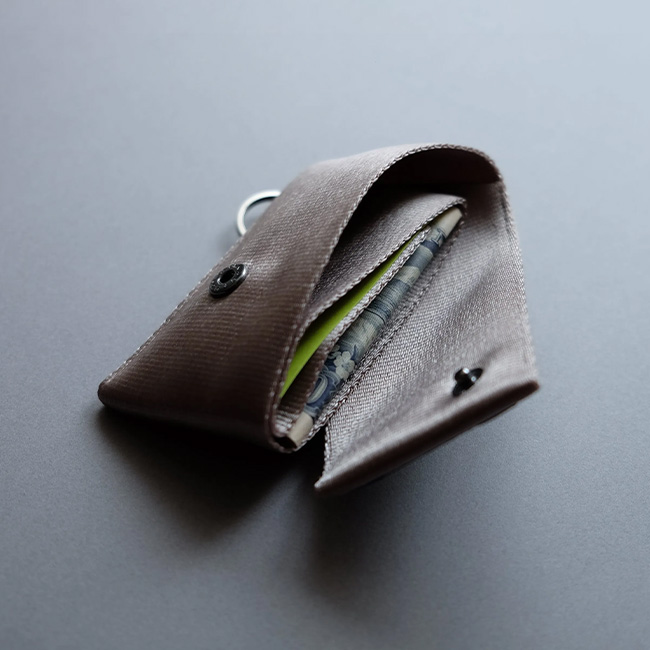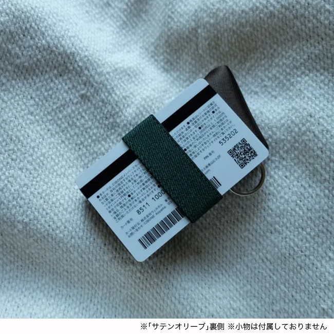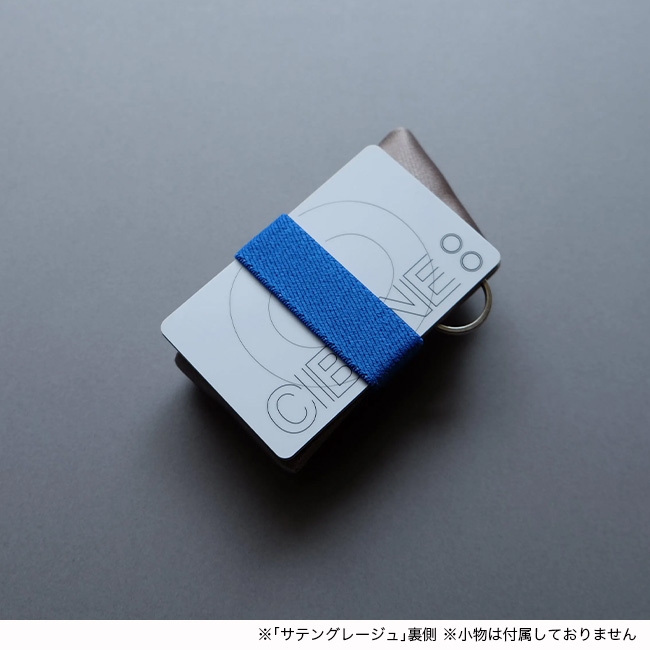 背面にはカード、定期券を束ねる為のゴムを配し、必要最低限の機能を持たせています(推奨1~5枚)。掌サイズで、シャツ・ジャケット・パンツポケットにスムーズに収まります。