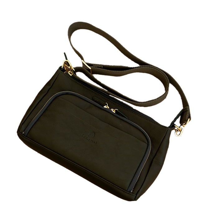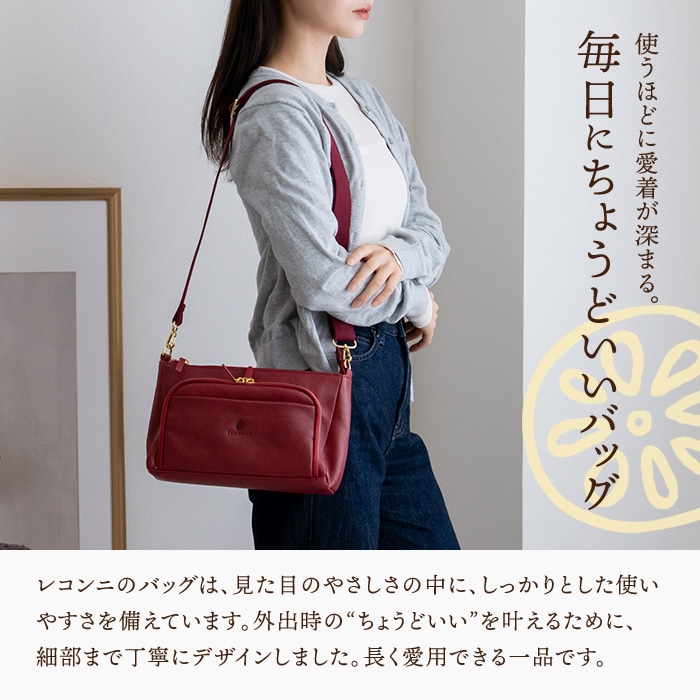 使うほどに愛着が深まる、毎日にちょうどいいバッグ。 レコンニのバッグは、見た目のやさしさの中にしっかりと使いやすさを備えています。 素材は、風合いのある本革を使用しています。 触りたくなるやわらかな手触りでありながら、型崩れしにくく、 日々の暮らしに寄り添いながら、美しく育っていく素材です。 フロントポケット内に、カードポケットや、ファスナーポケットがあるので、 フロントポケットをお財布として使用できる、お財布ショルダータイプ。 メインポケットは、スマホやポーチなどをまとめて収納できるゆとりあるスペースです。 ミニバッグとしても使いやすいコンパクトな見た目でも収納力があり、必要なものをまとめて持ち運べます。 外出時の“ちょうどいい”を叶える、実用性の高い仕様です。 細部にまで丁寧にデザインし、長くご愛用いただけるこだわりのバッグです。