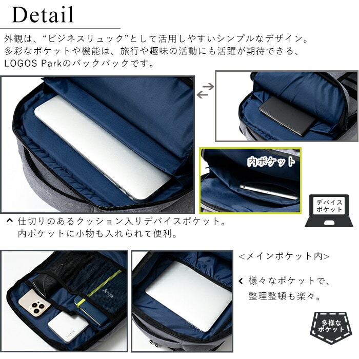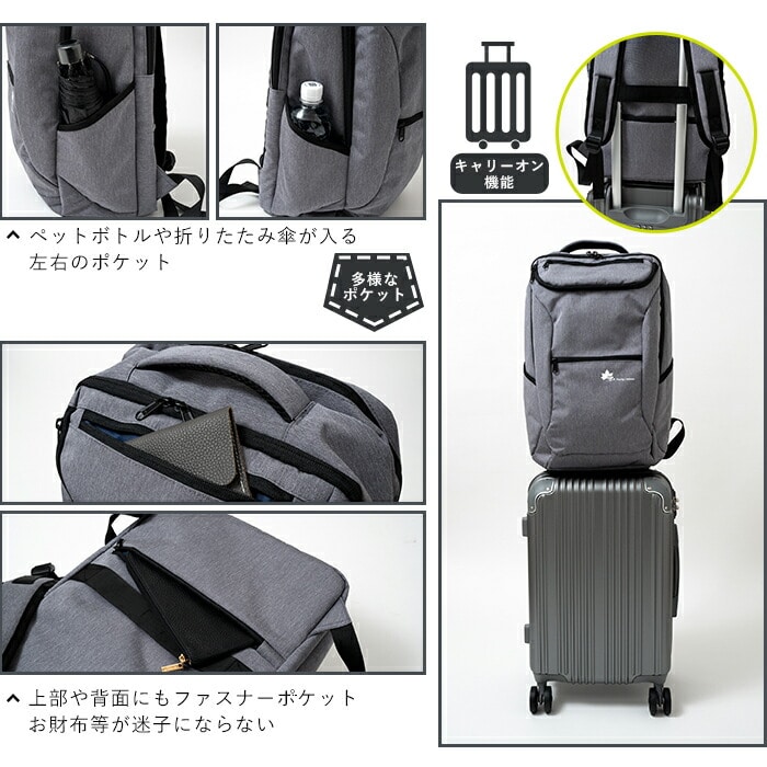 シンプルなのでビジネスでもプライベートでも様々な場面での活躍が期待できます。ノートパソコンやタブレットを収納できるデバイスポケットをはじめ、さまざまなポケットにスマートに荷物を収納でき、キャリーケースに装着できるベルトもあります。通学や通勤、出張や旅行にうれしい機能が満載です。