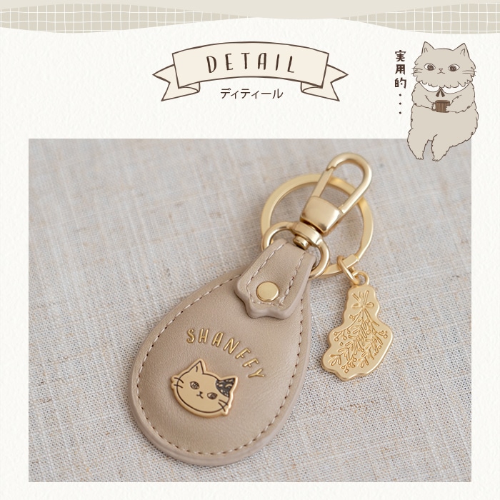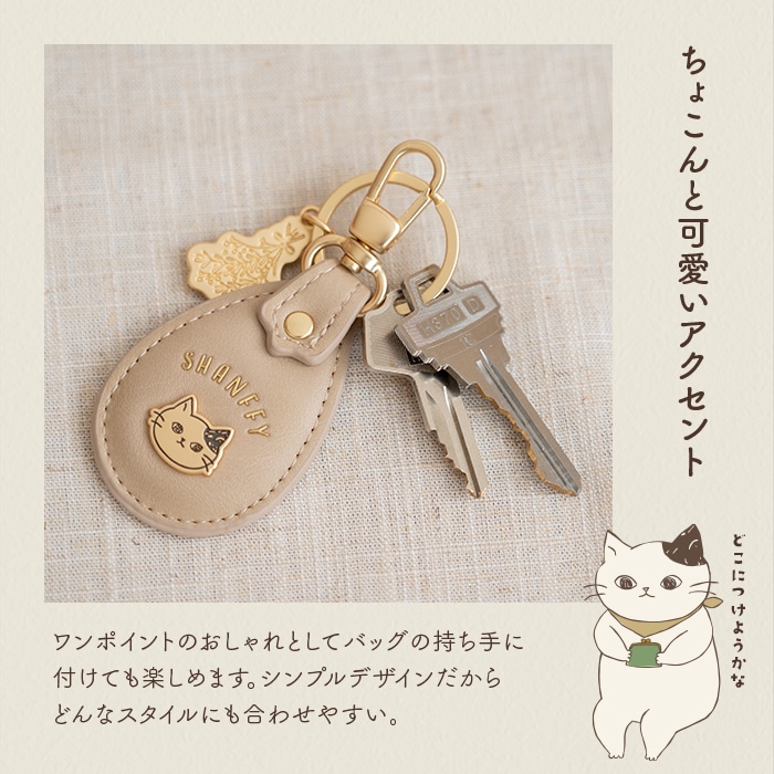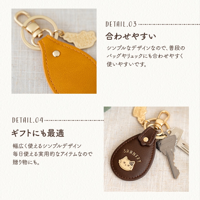 どんな時でも自分らしく暮らすねこたちと共に、あなたらしい毎日を—。 どんな時でも自分らしく暮らす猫のRINE(リーネ)、LEU(リュー)、COCO(ココ)が、 ふわふわ気ままに、あなたの日々をほっこり彩ります。 かわいいだけじゃなく、合わせやすく、使いやすさも追及したキーホルダーです。 ワンポイントのおしゃれとして、バッグやリュックにつけても映えます。 シンプルデザインなので合わせやすく、ちょこんと可愛いアクセントに。 もちろん、キーホルダーとしても使いやすい仕様です。 鍵をひとまとめにしておけば、必要なときにバッグの中でも迷子にならずにすぐ取り出せます。 幅広く使えるシンプルデザインかつ、実用的なアイテムなので贈り物にもおすすめです。 愛着のわく絶妙な形状とサイズで、毎日一緒にいたいアイテムが誕生しました。 日常をさりげなく彩れるよう、ゆれるチャームのデザインも上品でシンプルにこだわっています。 SHANFFYの猫モチーフが、あなたの毎日をそっと彩ります。 \自分らしく暮らすかわいい猫たちの日常は、SNSでも発信中です。/