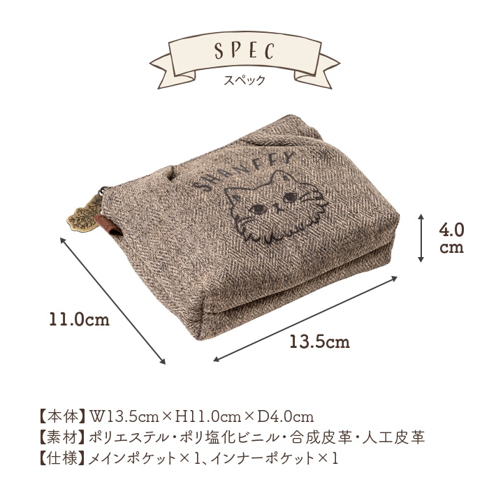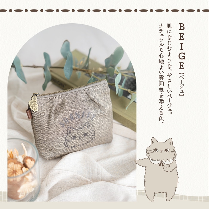 どんな時でも自分らしく暮らすねこたちと共に、あなたらしい毎日を—。 どんな時でも自分らしく暮らす猫のRINE(リーネ)、LEU(リュー)、COCO(ココ)が、 ふわふわ気ままに、あなたの日々をほっこり彩ります。 かわいいだけじゃなく、使いやすさも追及したタックポーチです。 すっきりしたスクエア型のフォルムに必要なものをしっかり収められる安心感。 小さめでも意外と収納力があり、必要なアイテムをコンパクトに持ち歩けます。 内ポケットがあるので、リップや鍵などポーチの中で迷子になりやすいものも、分けて収納できて安心。 カラーごとに異なる猫モチーフや、やさしい質感と丁寧なつくりで個性を引き立てるデザインです。 愛着のわく絶妙な形状とサイズで、毎日一緒にいたいアイテムが誕生しました。 日常をさりげなく彩れるよう、ゆれるチャームのデザインも上品でシンプルにこだわっています。 SHANFFYの猫モチーフが、あなたの毎日をそっと彩ります。 \自分らしく暮らすかわいい猫たちの日常は、SNSでも発信中です。/