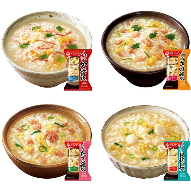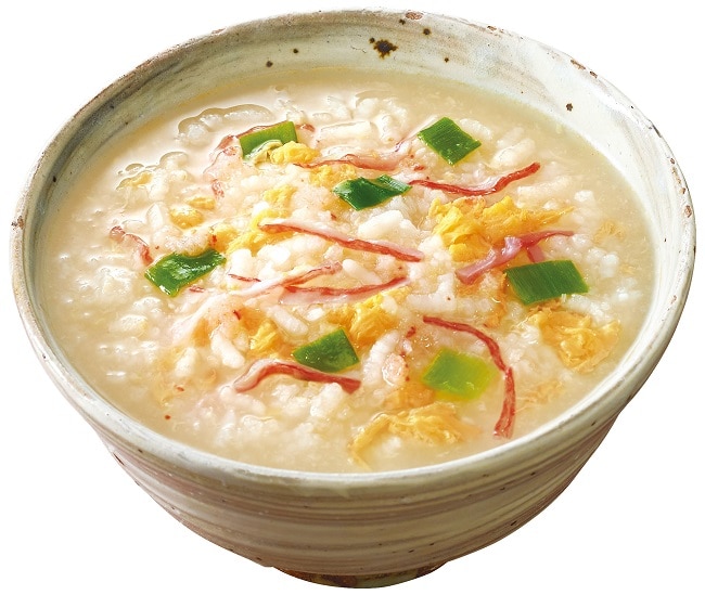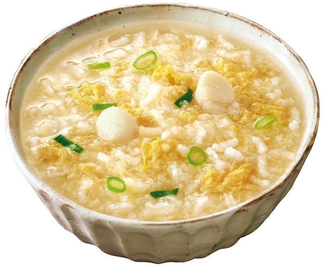 精白米(国産)、液全卵、ボイルいたやがい貝柱、ねぎ、チキンエキス、ホタテエキス、かにエキス、食塩、砂糖、魚介エキスパウダー、あさりエキス、しょうゆ、酵母エキスパウダー/調味料(アミノ酸等)、増粘剤(加工デンプン)、酸化防止剤(ビタミンE)、香料、(一部にえび・かに・小麦・卵・いか・大豆・鶏肉を含む)