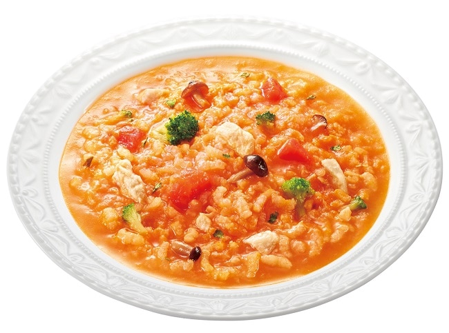精白米(国産)、トマトペースト、ブロッコリー、ぶなしめじ、蒸し鶏肉、グリルトマト、クリーム、パルメザンチーズパウダー、ゴルゴンゾーラチーズパウダー、バター、ポークエキス、チキンエキスパウダー、食塩、チキンエキス、砂糖、香辛料、ブイヨン風調味料、酵母エキスパウダー、乾燥パセリ/調味料(アミノ酸等)、酸味料、pH調整剤、酸化防止剤(ビタミンE)、香辛料抽出物、(一部に小麦・乳成分・大豆・鶏肉・豚肉を含む)
