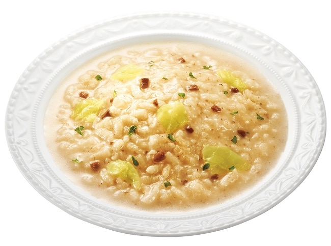 精白米(国産)、オニオンソテー、キャベツ、ソテーマッシュルーム、ゴーダチーズパウダー、パルメザンチーズパウダー、バター、ゴルゴンゾーラチーズパウダー、果実酒、ポークエキス調味料、食塩、ブイヨン風調味料、オニオンエキス、香辛料、酵母エキスパウダー、乾燥パセリ/調味料(アミノ酸等)、酸味料、酸化防止剤(ビタミンE)、香辛料抽出物、(一部に小麦・乳成分・大豆・豚肉を含む)