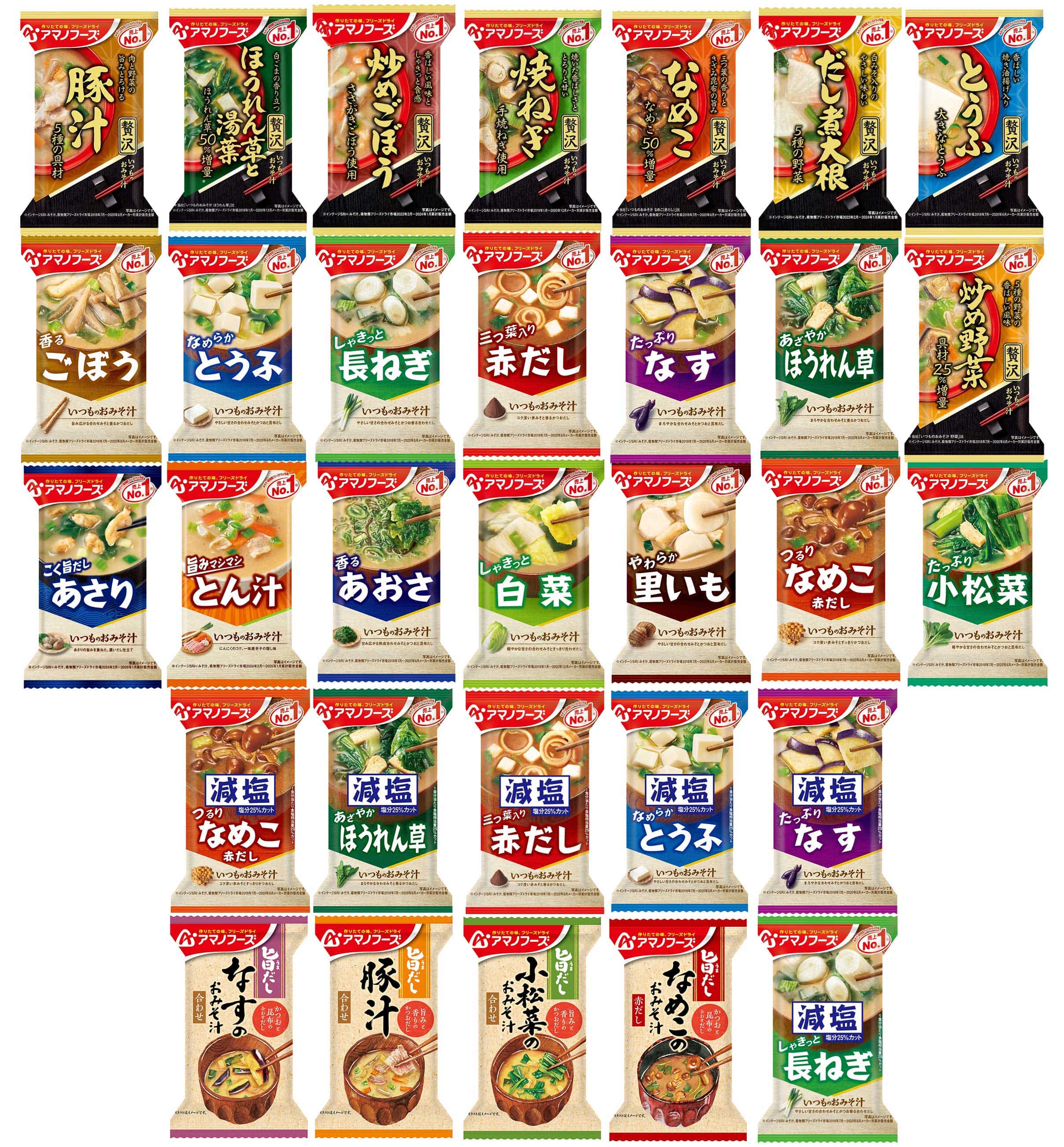 なす、長ねぎ、とうふ、ほうれん草、なめこ(赤だし)、ごぼう、赤だし(三つ葉)、とん汁、あおさ、白菜、あさり、里いも、小松菜、減塩なす、減塩ほうれん草、減塩とうふ、減塩赤だし(三つ葉)、減塩なめこ(赤だし)、減塩長ねぎ