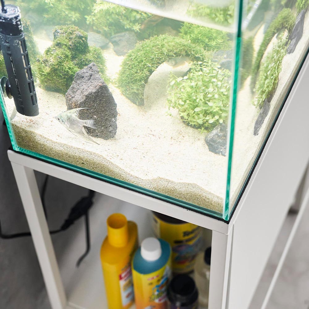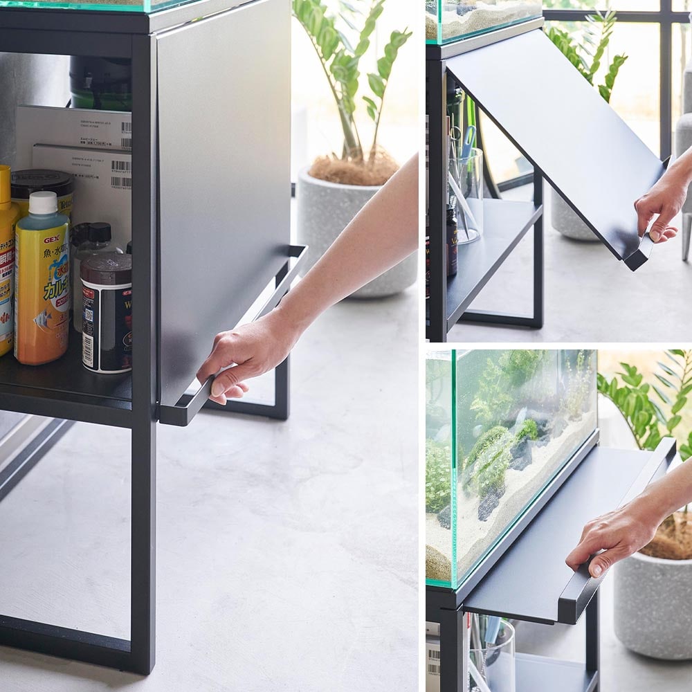 60cmサイズの水槽を飾れる、スチールのフレームがスタイリッシュな水槽ラック。ラック下段は収納棚になっており、フィルターやエサなどの飼育グッズをまとめて収納できます。収納棚の前にある跳ね上げ式の扉はマグネットでピタッと本体に固定されます。扉を閉めると生活感のないスッキリとした見た目に。開いた扉はラックの中にしまえるので、両手を使って重たい物や収納物を出し入れできます。扉を少し引き出すとちょっとした作業台となり、水槽のお手入れやお魚のお世話などの際に小物を一時置きできて便利です。どんな空間にも溶け込むシンプルなデザインなので、リビングや玄関などで水槽をおしゃれにディスプレイできます。