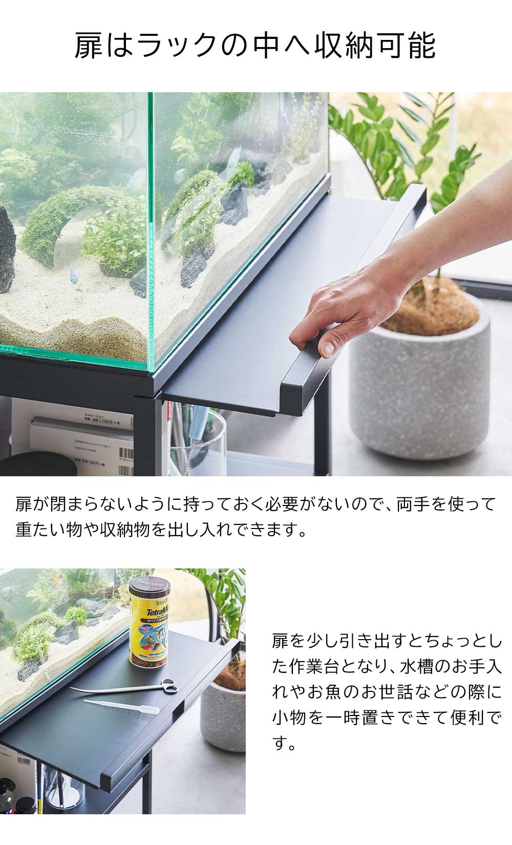 60cmサイズの水槽を飾れる、スチールのフレームがスタイリッシュな水槽ラック。ラック下段は収納棚になっており、フィルターやエサなどの飼育グッズをまとめて収納できます。収納棚の前にある跳ね上げ式の扉はマグネットでピタッと本体に固定されます。扉を閉めると生活感のないスッキリとした見た目に。開いた扉はラックの中にしまえるので、両手を使って重たい物や収納物を出し入れできます。扉を少し引き出すとちょっとした作業台となり、水槽のお手入れやお魚のお世話などの際に小物を一時置きできて便利です。どんな空間にも溶け込むシンプルなデザインなので、リビングや玄関などで水槽をおしゃれにディスプレイできます。 水槽は付属いたしません。