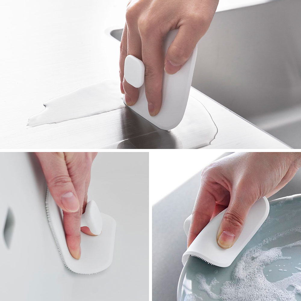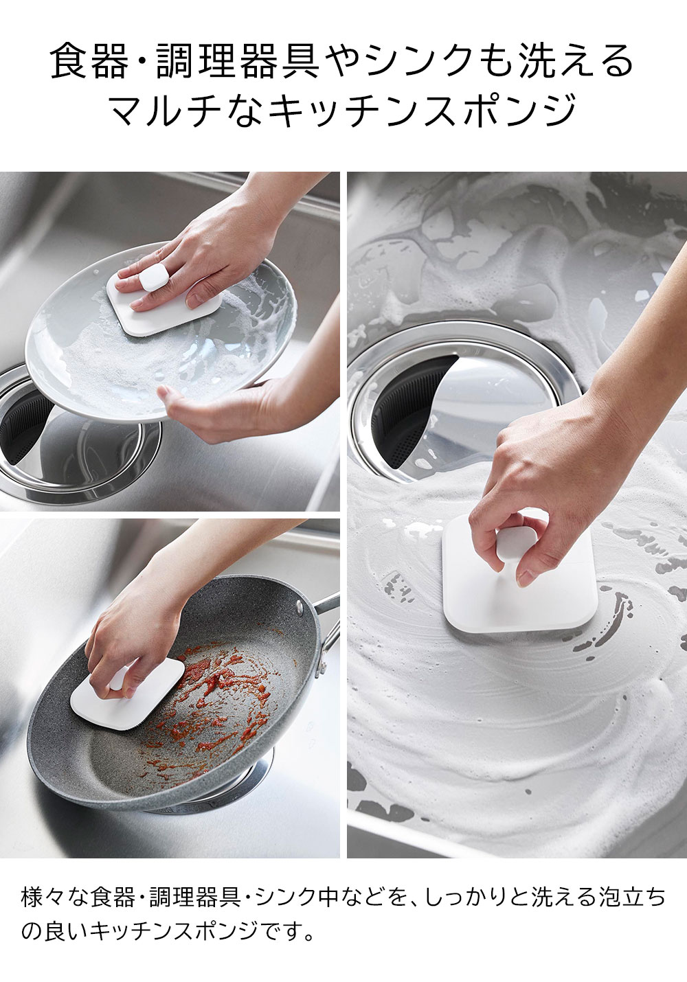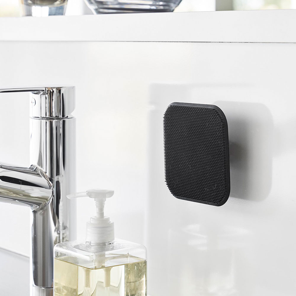 マグネットが付く壁面に浮かせて収納できるシリコーン製のキッチンスポンジです。柔らかく、良くしなり、小回りも利くから、食器やザルの細かい網目などの調理器具・シンクの角にもぴったりとフィット。泡立ちも良くきれいに洗えます。浮かせているので乾きやすく、スポンジ面が壁面に接触しないので衛生的です。使用後のキッチンやシンクまわりの水切りに、スクイージーとしてもお使いいただけます。