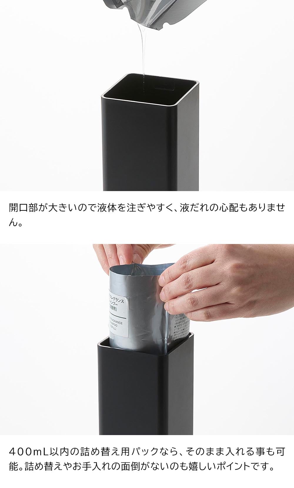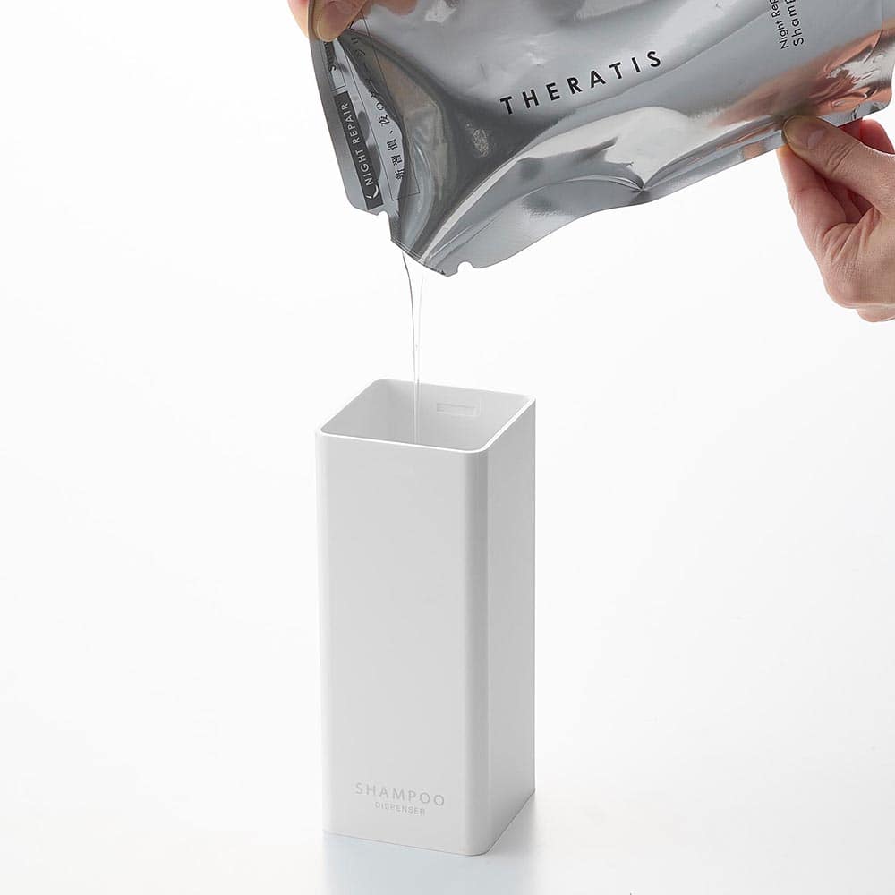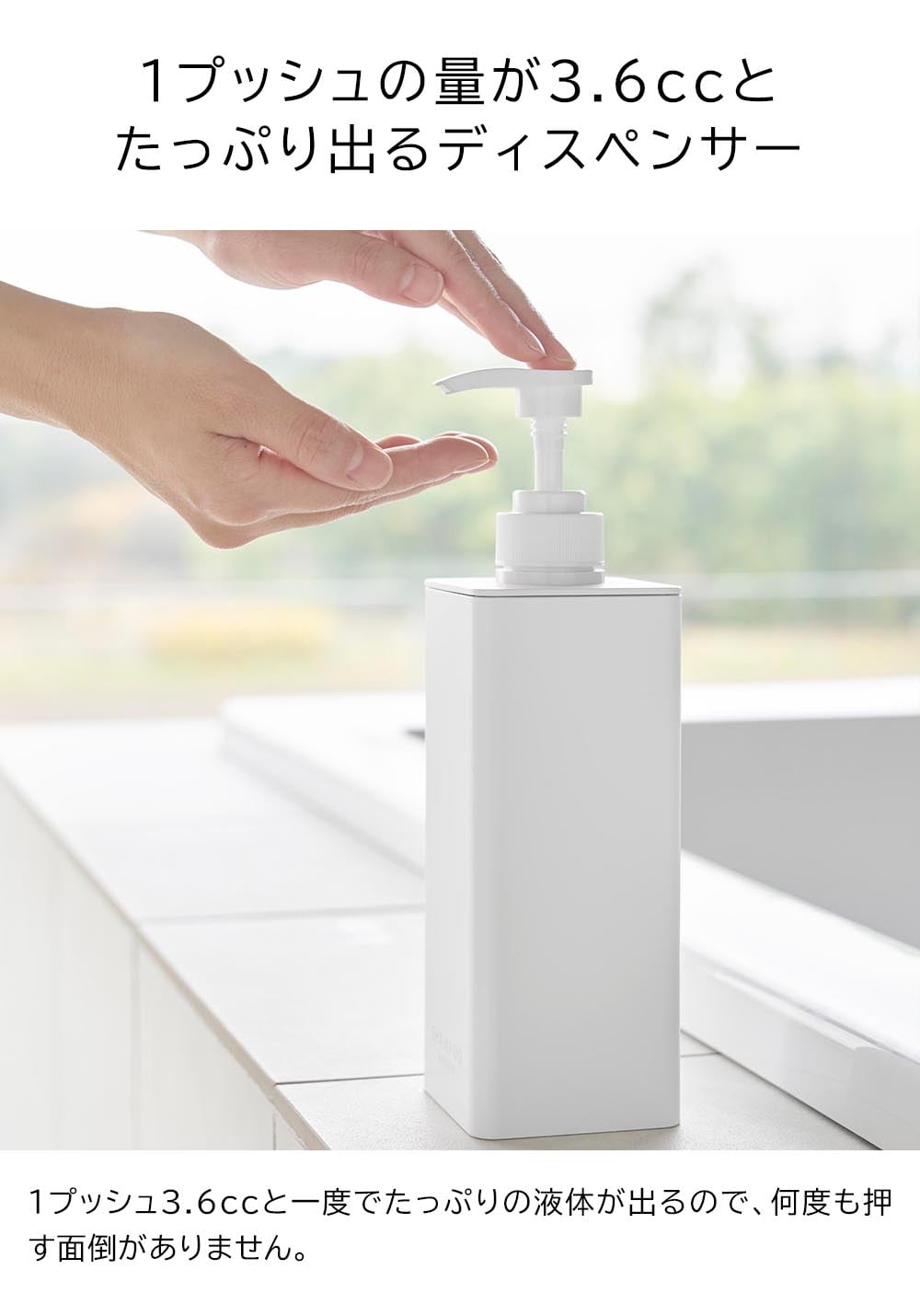 1プッシュで3.6ccと、たっぷり液体が出るディスペンサーです。一度でたっぷりと量が出るので、何度も押す面倒がありません。蓋が外れてお手入れが簡単にできます。開口部が大きいので、詰め替えの液体を注ぎやすく、また、液だれの心配もないので安心です。400mL以内の詰め替え用パックなら、そのまま入れて使うことも可能です。シンプルでスタイリッシュなデザインだから、浴室にボトルを置いてもゴチャつかず、生活感を一掃してくれます。