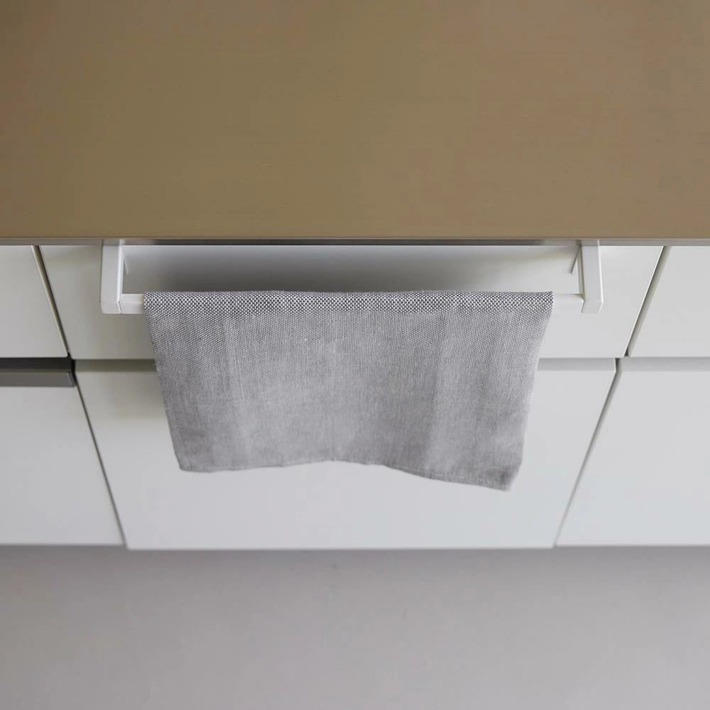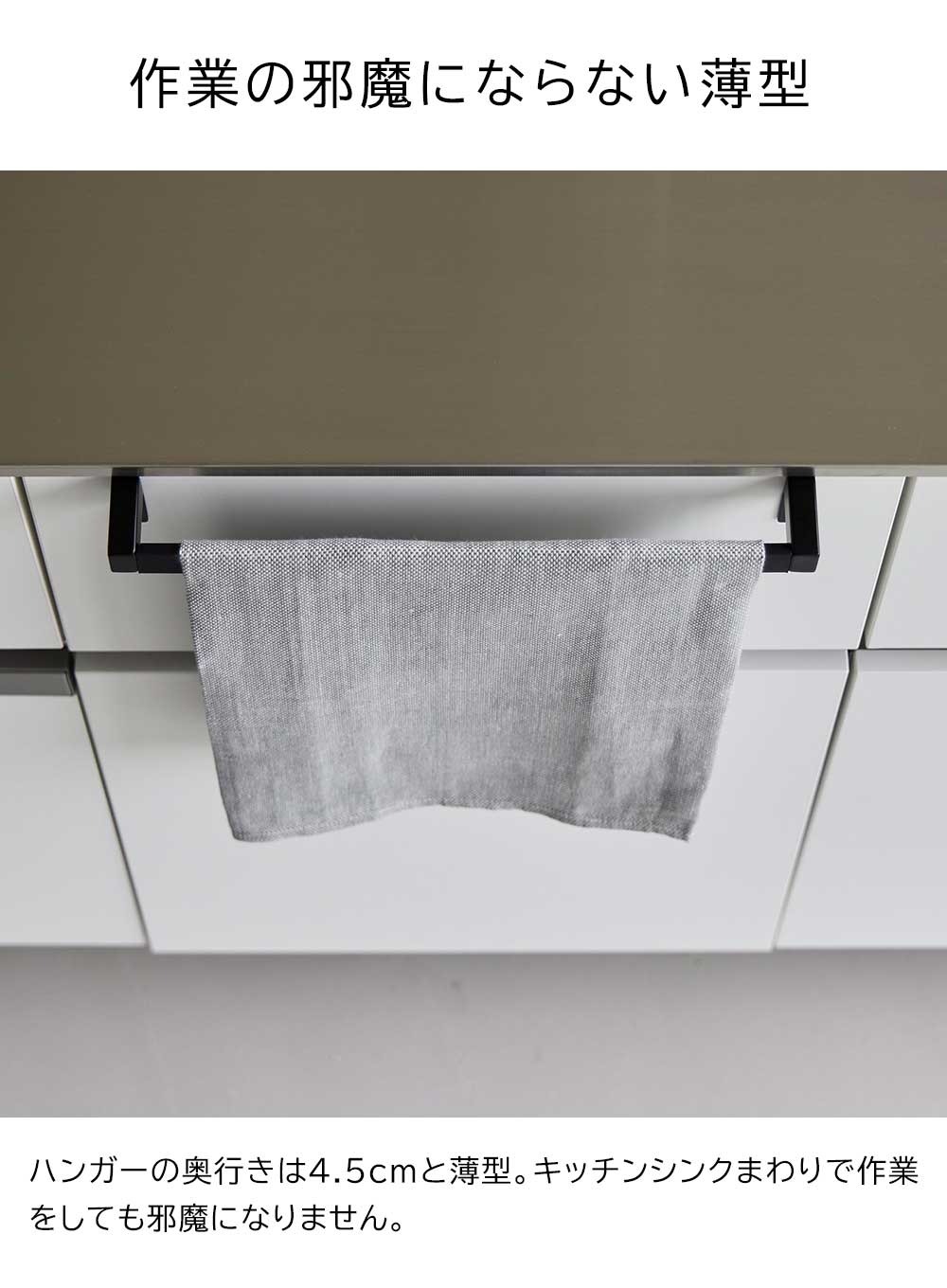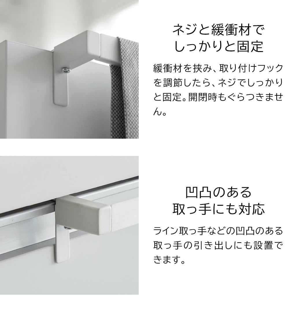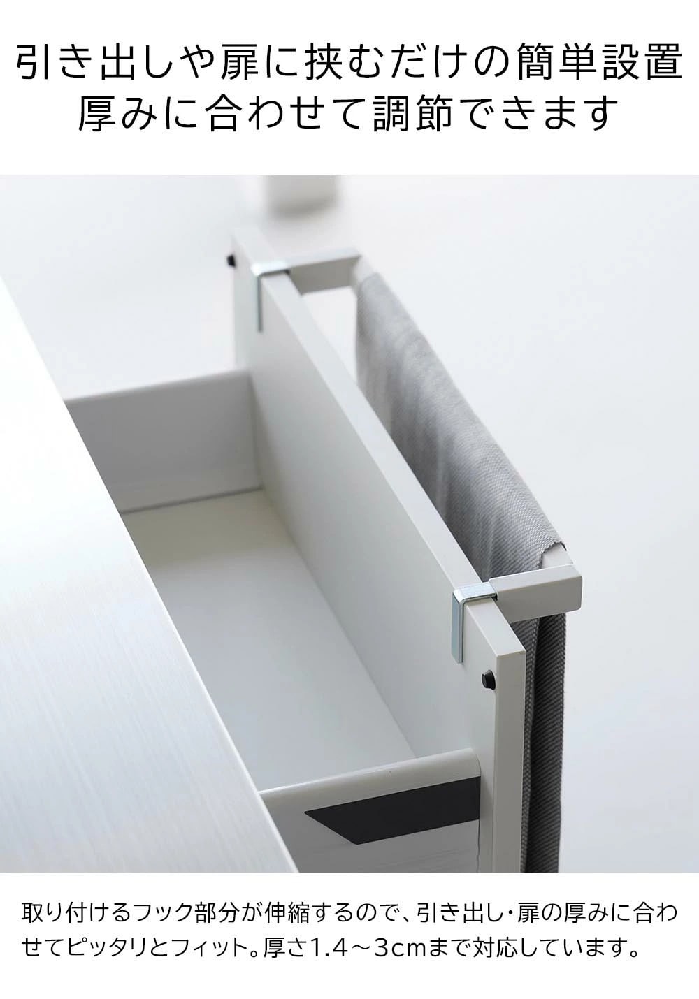 引き出しや扉に挟むだけの簡単設置!シンクキッチンタオルの滑り落ちを防止してくれるタオルハンガーです。ハンガーのバー部分がシリコーン素材でできており、上部が角ばった形状なので、タオルで手を拭いた時もしっかりとホールド!滑り落ちにくくなっています。厚さ約1.4~3cmまでの引き出し・扉に対応しており、設置箇所の厚みにフックを合わせてネジで固定するだけで設置完了。タオルを2枚並べて収納できるワイドサイズなので、使い分けに便利。奥行き4.5cmと、キッチンでの作業の邪魔にならない薄型なのも嬉しいポイントです。