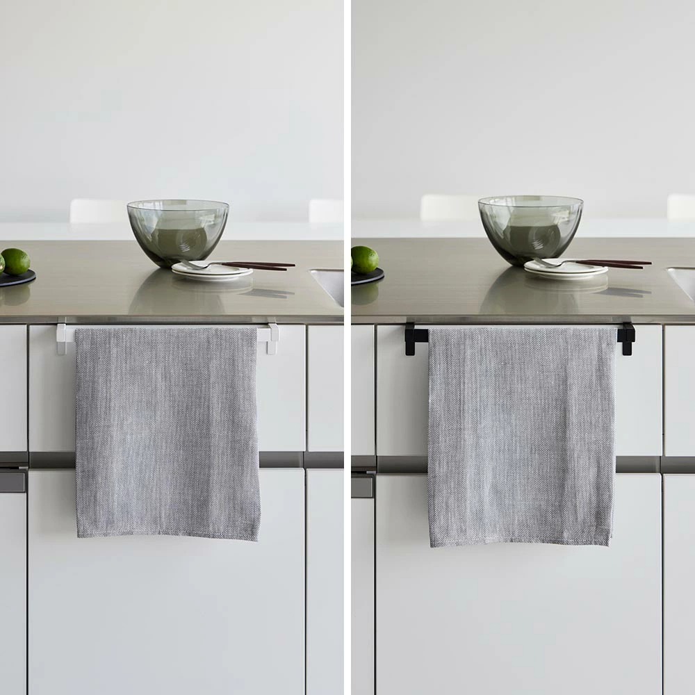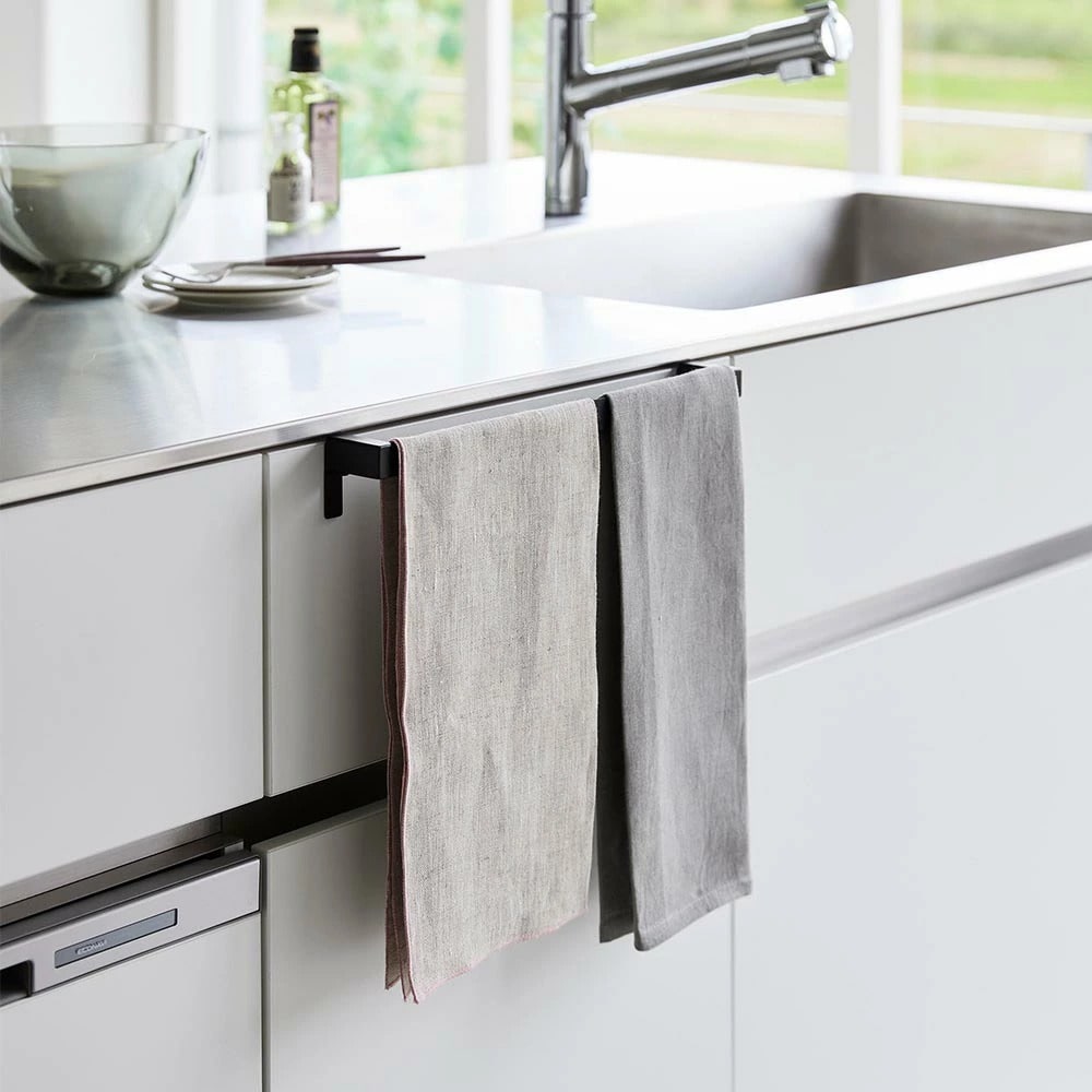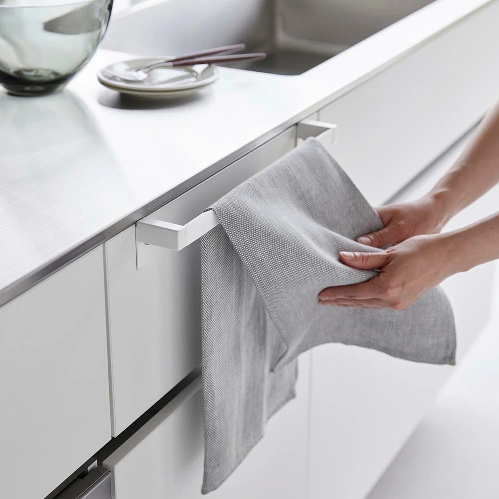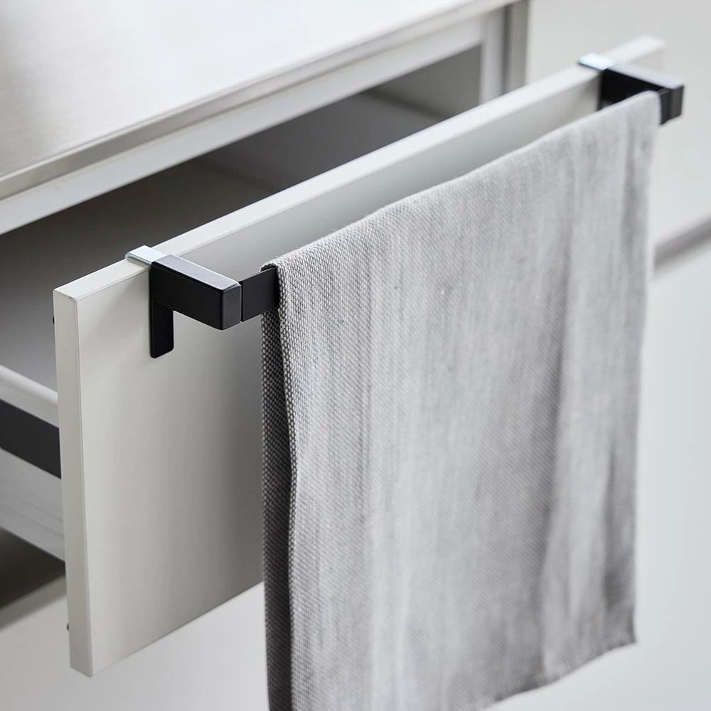 引き出しや扉に挟むだけの簡単設置!シンクキッチンタオルの滑り落ちを防止してくれるタオルハンガーです。ハンガーのバー部分がシリコーン素材でできており、上部が角ばった形状なので、タオルで手を拭いた時もしっかりとホールド!滑り落ちにくくなっています。厚さ約1.4~3cmまでの引き出し・扉に対応しており、設置箇所の厚みにフックを合わせてネジで固定するだけで設置完了。タオルを2枚並べて収納できるワイドサイズなので、使い分けに便利。奥行き4.5cmと、キッチンでの作業の邪魔にならない薄型なのも嬉しいポイントです。