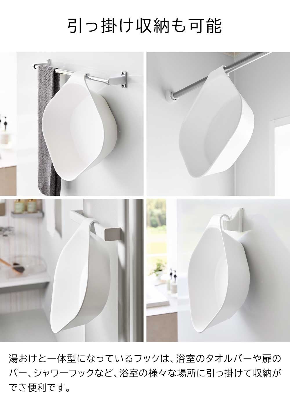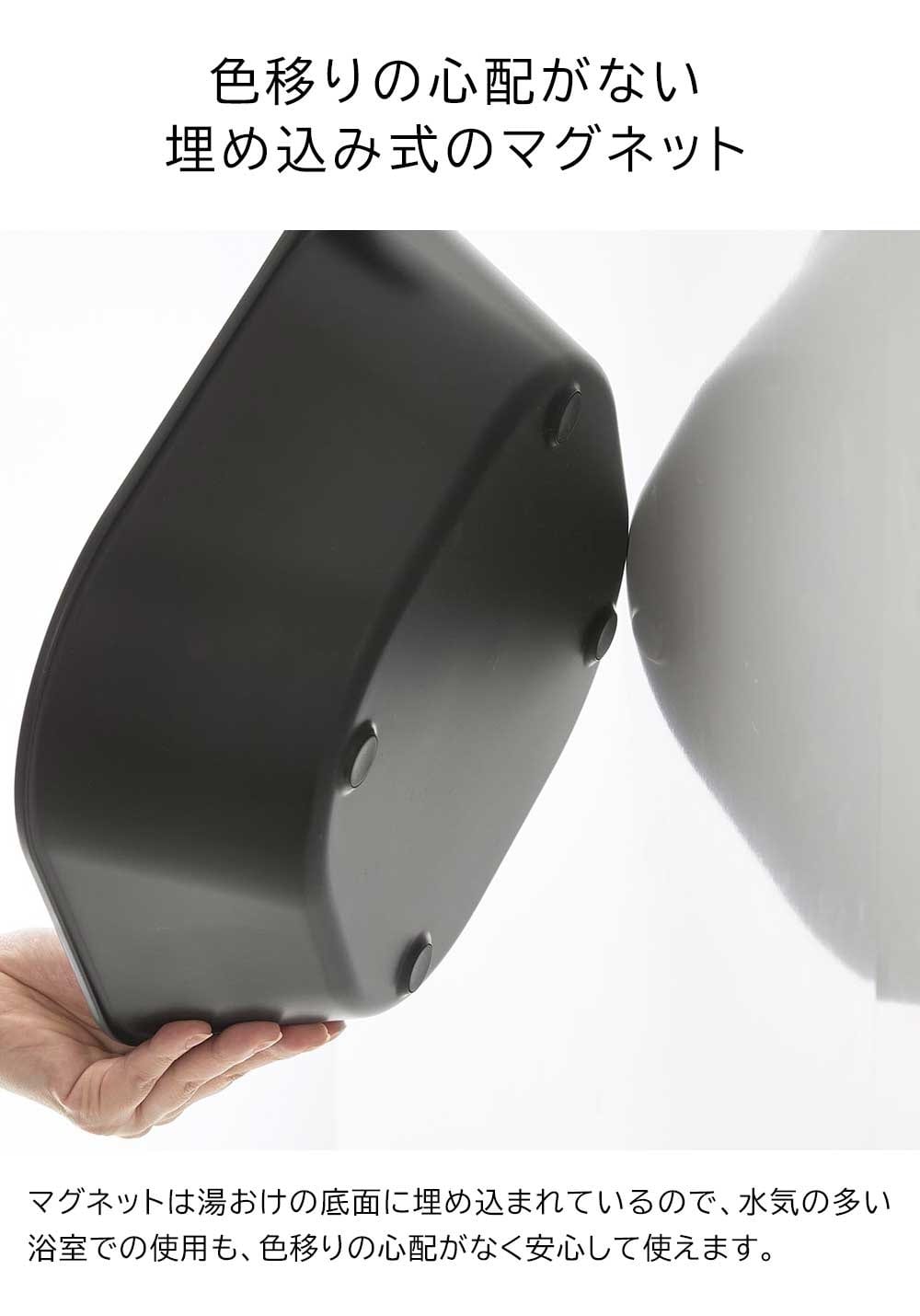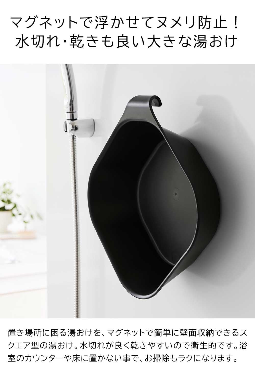 お風呂で置き場所に困る湯おけを、マグネットでペタッと簡単に壁面収納できるスクエア型の湯おけ。 水切れが良く乾きやすいので、ヌメリにくく衛生的です。 浴室のカウンターや床に置かない事で、お掃除もラクになります。 マグネットは湯おけの底面に埋め込まれているので、壁や床への色移りを防ぎます。 また、湯おけと一体型になっているフックは、浴室のタオルバーや扉のバー、シャワーフックなど、浴室の様々な場所に引っ掛けて収納ができ便利です。