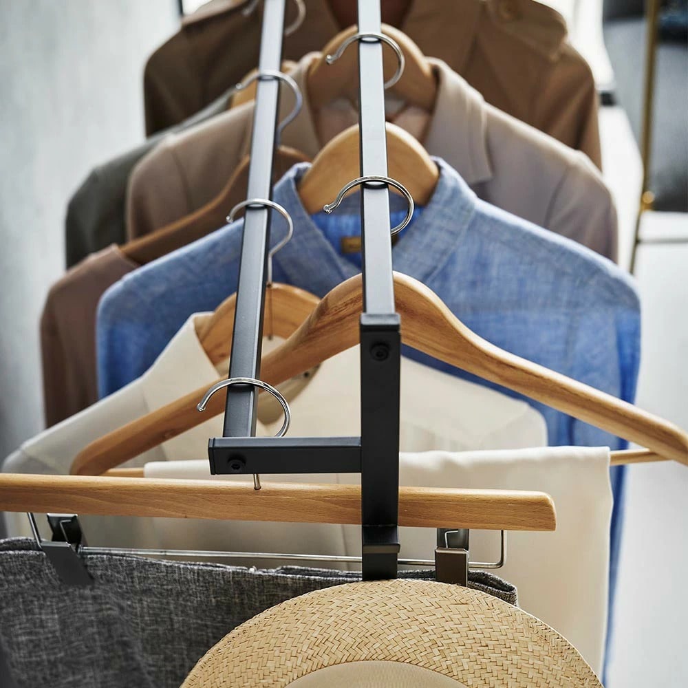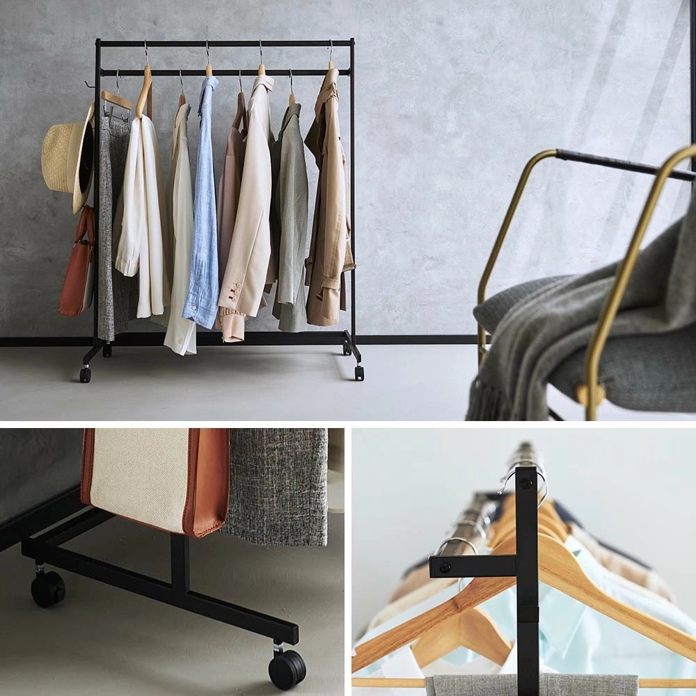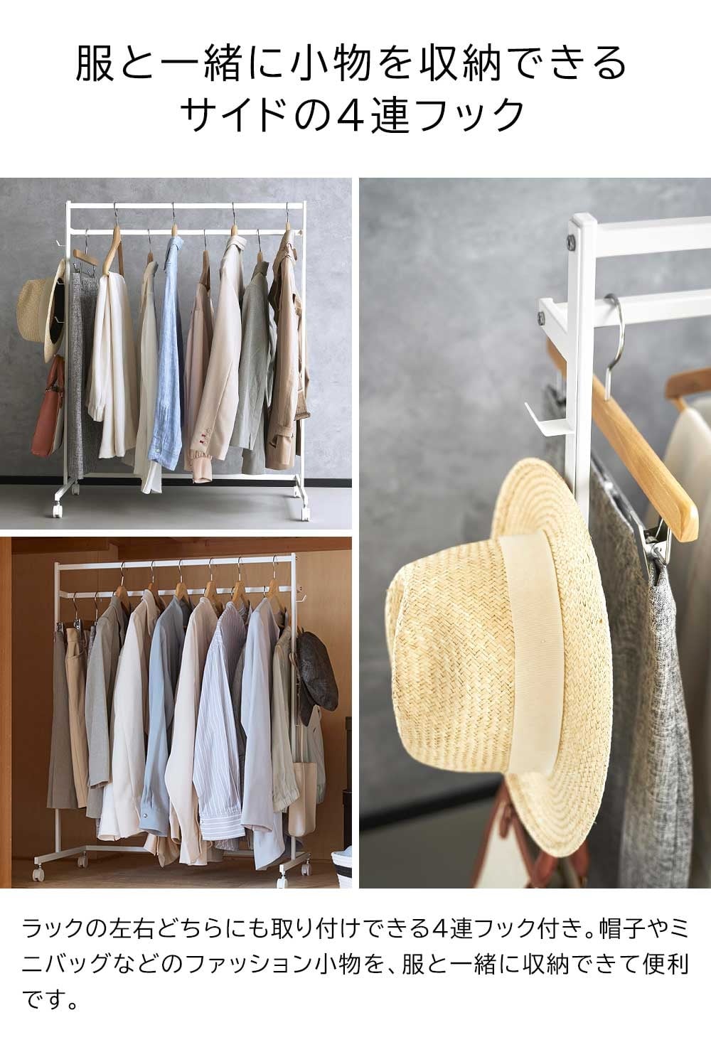 上段・下段に服を掛けるからハンガー部分の厚みが減り、収納力が上がる2段式のハンガーラックです。服でいっぱいの収納スペースに余裕ができるので、服選びがしやすくなり身支度もスムーズに。クローゼットに掛けた服の下にこちらのラックを置くだけで収納量が上がり、デッドスペースを収納スペースに変えてくれます。押入れにも収まるサイズなので、押入れを新たにクローゼットとして活用!お部屋の空間を無駄なく使える優れものです。また、縦・横どちらの向きでもスペースに合わせて設置可能。キャスター付きで移動や掃除もラクラクです。サイドの4連フックには、帽子やミニバッグなどのファッション小物を収納。ラックの左右どちらにも取り付け可能です。