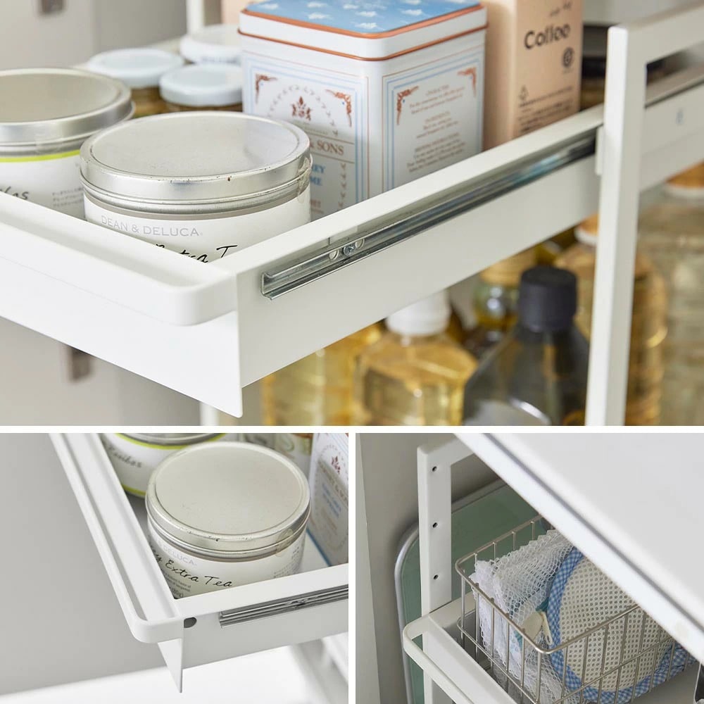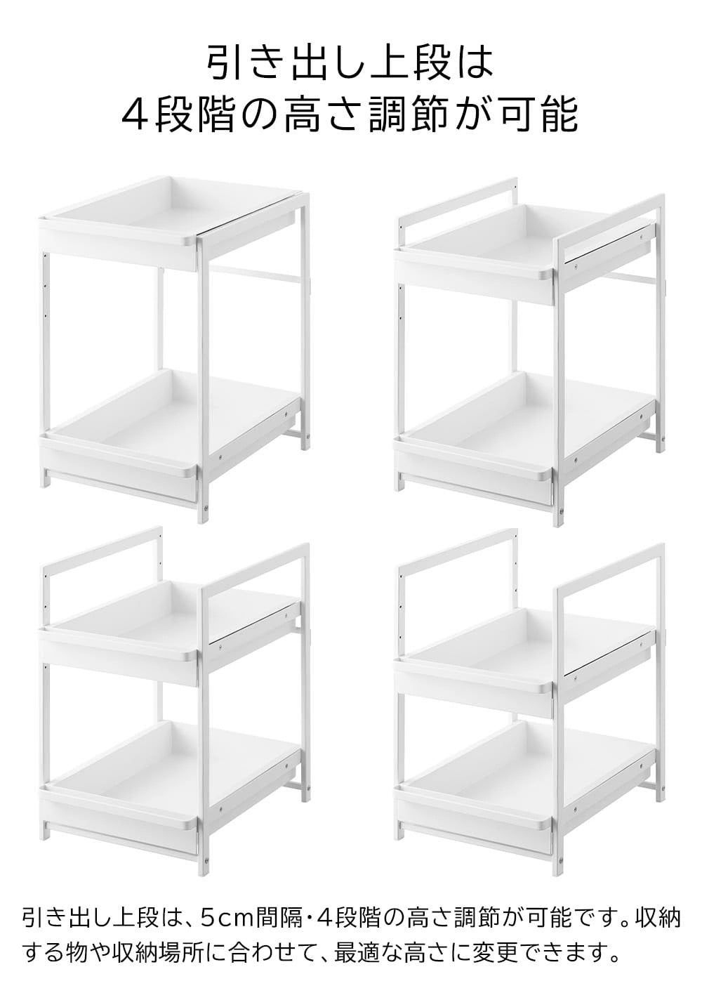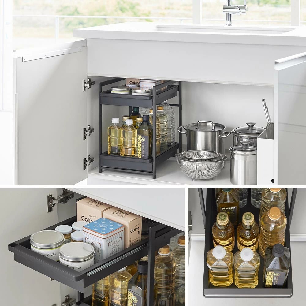 低い位置にあり、奥行きと高さがあるシンク下の収納スペースは、物の出し入れや整理がしにくく、空間も無駄にしがち。 こちらの2段のスライドラックを設置すれば、デッドスペースも有効活用して、使いやすい収納空間に変えることができます。 ハンドルを手前に引けば、スライドレールの付いたトレーが引き出され、直置きだと取り出しにくい奥の物もラクラク手に取ることができます。 上段のトレーは5cm刻みで4段階の高さ調節ができ、収納する物や置く場所に合わせて変更できます。キッチンシンク下以外にも、洗面台下の収納にも便利にお使いいただけます。
