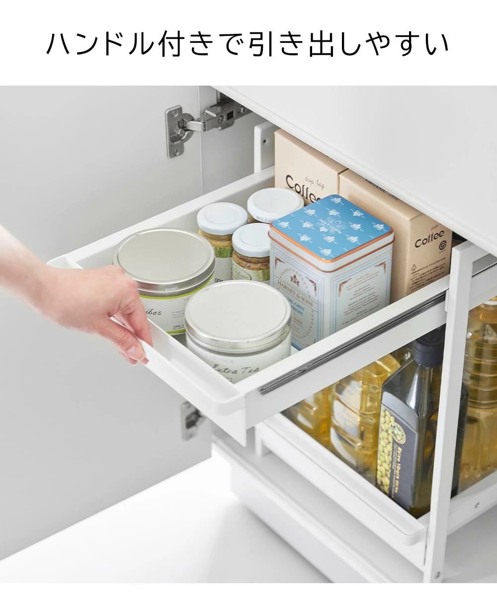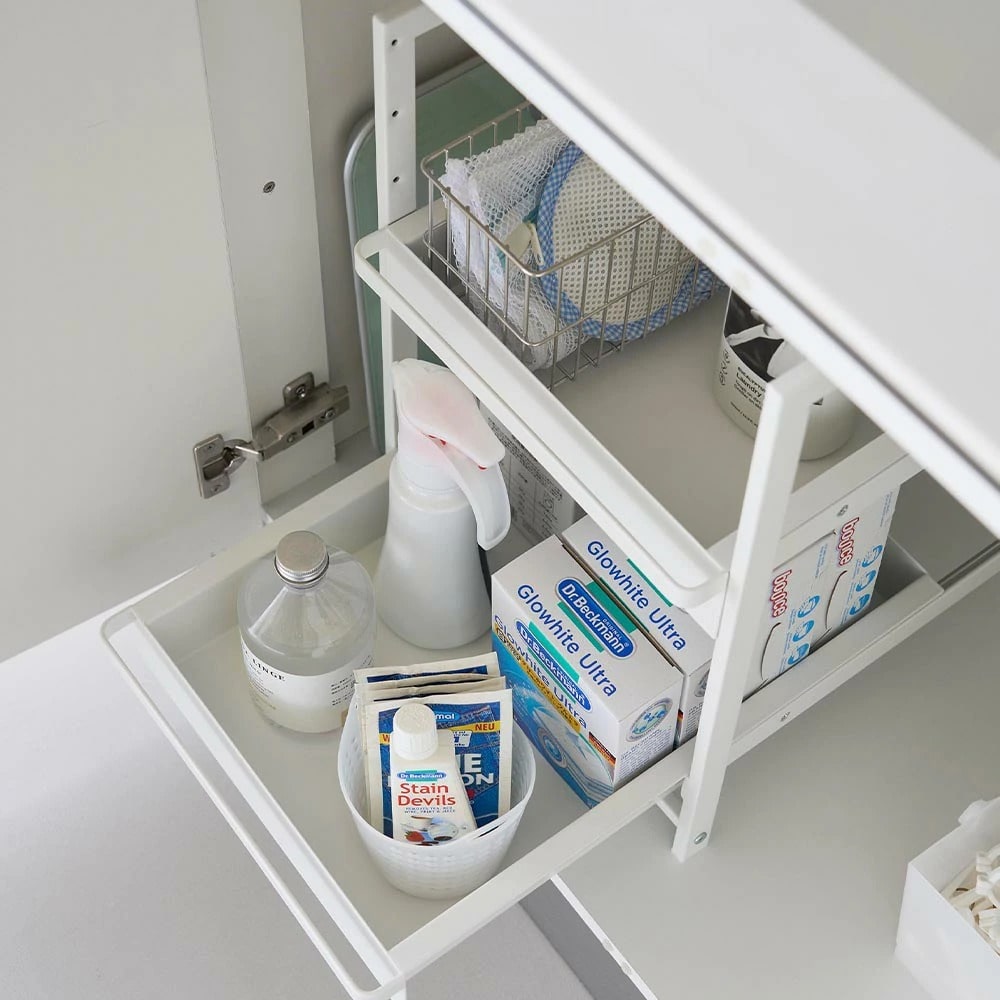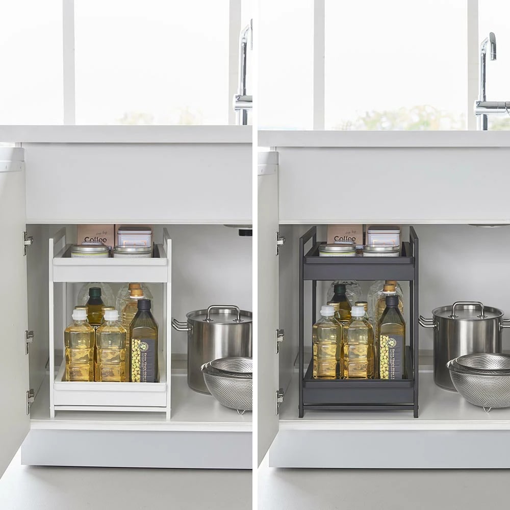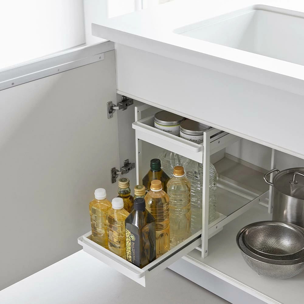 低い位置にあり、奥行きと高さがあるシンク下の収納スペースは、物の出し入れや整理がしにくく、空間も無駄にしがち。 こちらの2段のスライドラックを設置すれば、デッドスペースも有効活用して、使いやすい収納空間に変えることができます。 ハンドルを手前に引けば、スライドレールの付いたトレーが引き出され、直置きだと取り出しにくい奥の物もラクラク手に取ることができます。 上段のトレーは5cm刻みで4段階の高さ調節ができ、収納する物や置く場所に合わせて変更できます。キッチンシンク下以外にも、洗面台下の収納にも便利にお使いいただけます。