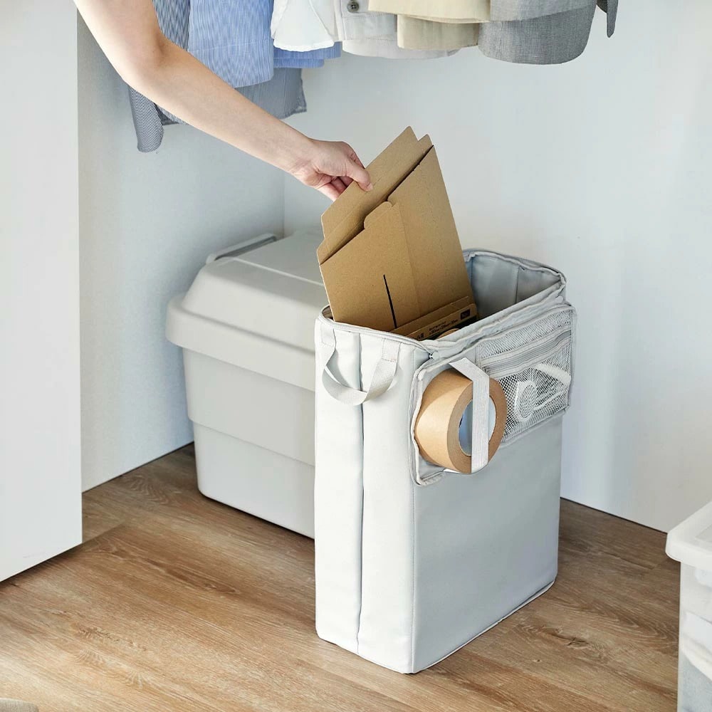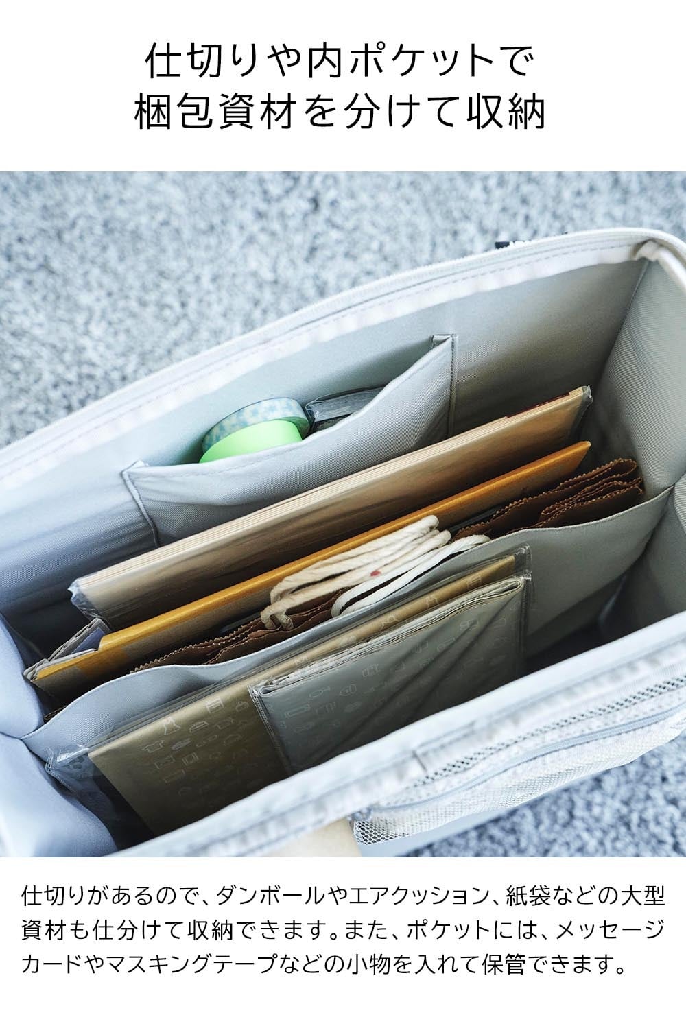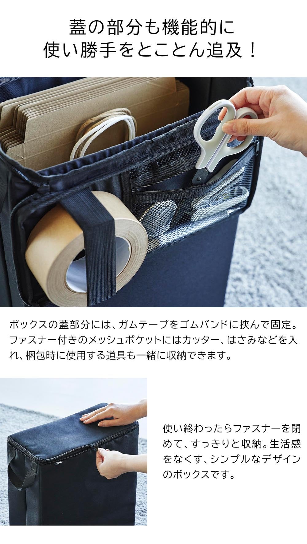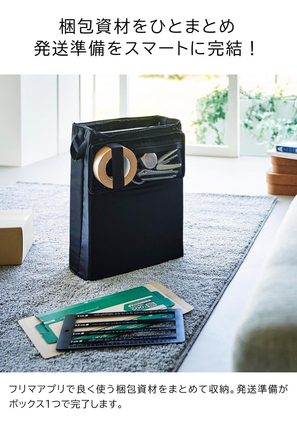 フリマの発送でよく使う梱包資材や梱包道具をまとめて収納できるボックス。 ボックス内に仕切りがあるので、ダンボールやエアクッション、紙袋などの梱包資材を 種類ごとに整理しやすいです。 内ポケットにはメッセージカードやマスキングテープなどの小物を収納できます。 また、蓋の裏面には、ガムテープを挟んで保管できるゴムバンドや、 カッターやハサミなどを収納するのに便利なメッシュポケットがあります。 使い終わったらファスナーを閉め、中身を隠して収納。 シンプルなデザインの収納ボックスなので生活感をなくせます。 持ち運びに便利なハンドルもあり、クローゼットや納戸などのちょっとした隙間に入る 幅15.5cmのスリムサイズのボックスです。