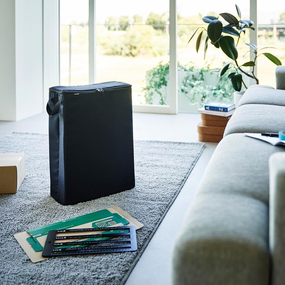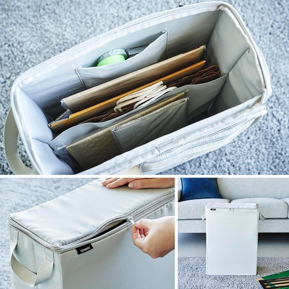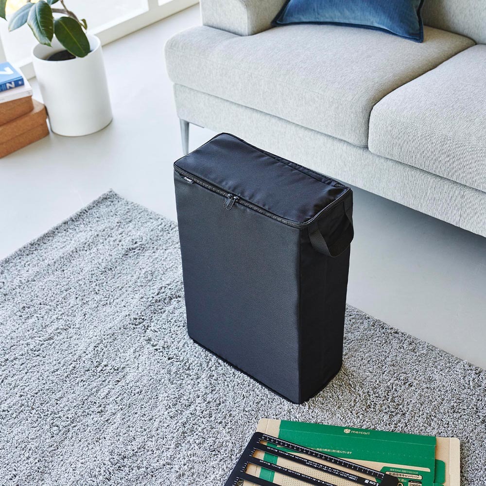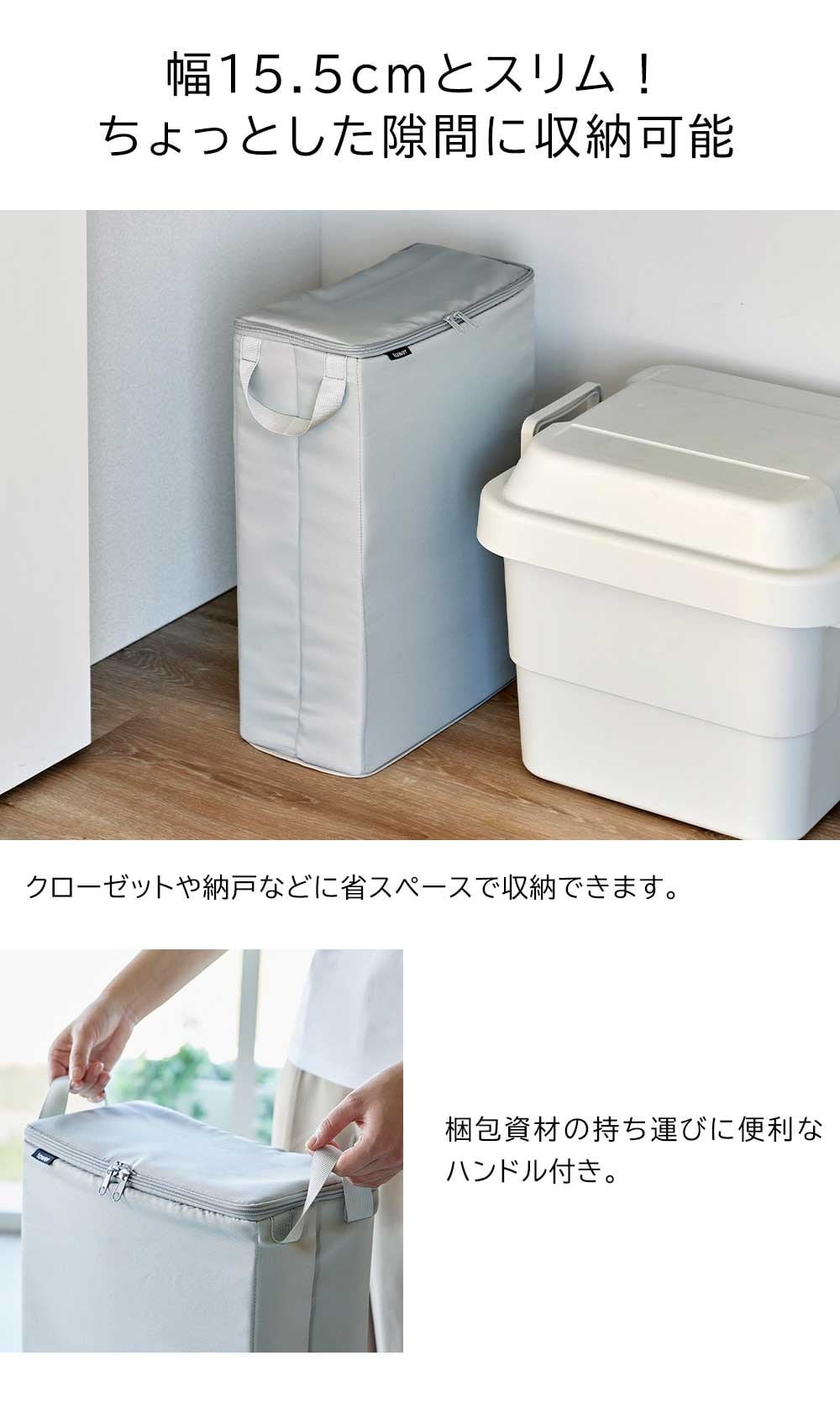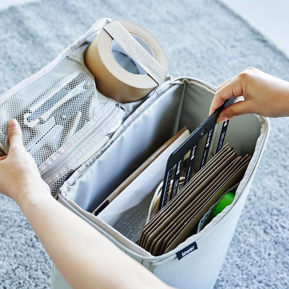 フリマの発送でよく使う梱包資材や梱包道具をまとめて収納できるボックス。 ボックス内に仕切りがあるので、ダンボールやエアクッション、紙袋などの梱包資材を 種類ごとに整理しやすいです。 内ポケットにはメッセージカードやマスキングテープなどの小物を収納できます。 また、蓋の裏面には、ガムテープを挟んで保管できるゴムバンドや、 カッターやハサミなどを収納するのに便利なメッシュポケットがあります。 使い終わったらファスナーを閉め、中身を隠して収納。 シンプルなデザインの収納ボックスなので生活感をなくせます。 持ち運びに便利なハンドルもあり、クローゼットや納戸などのちょっとした隙間に入る 幅15.5cmのスリムサイズのボックスです。