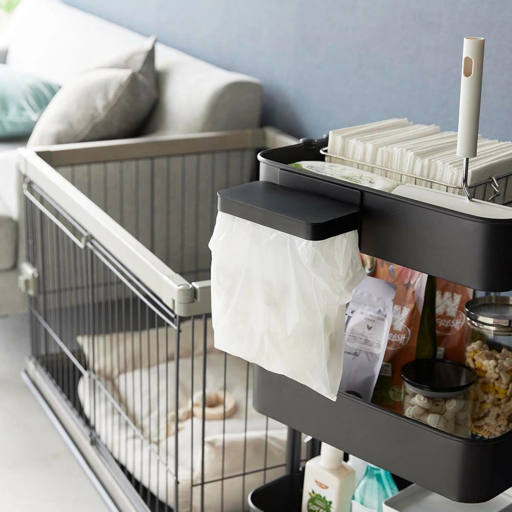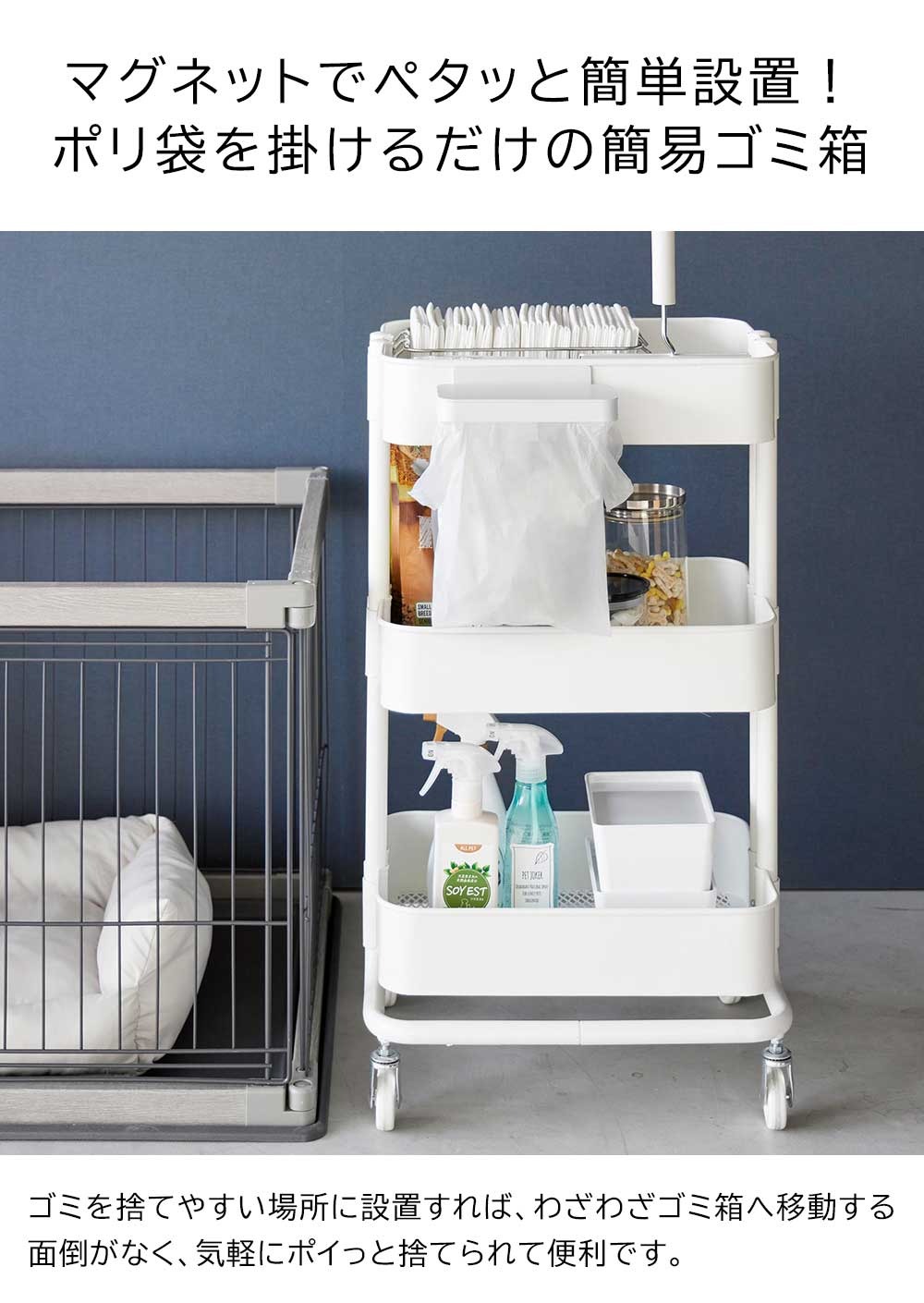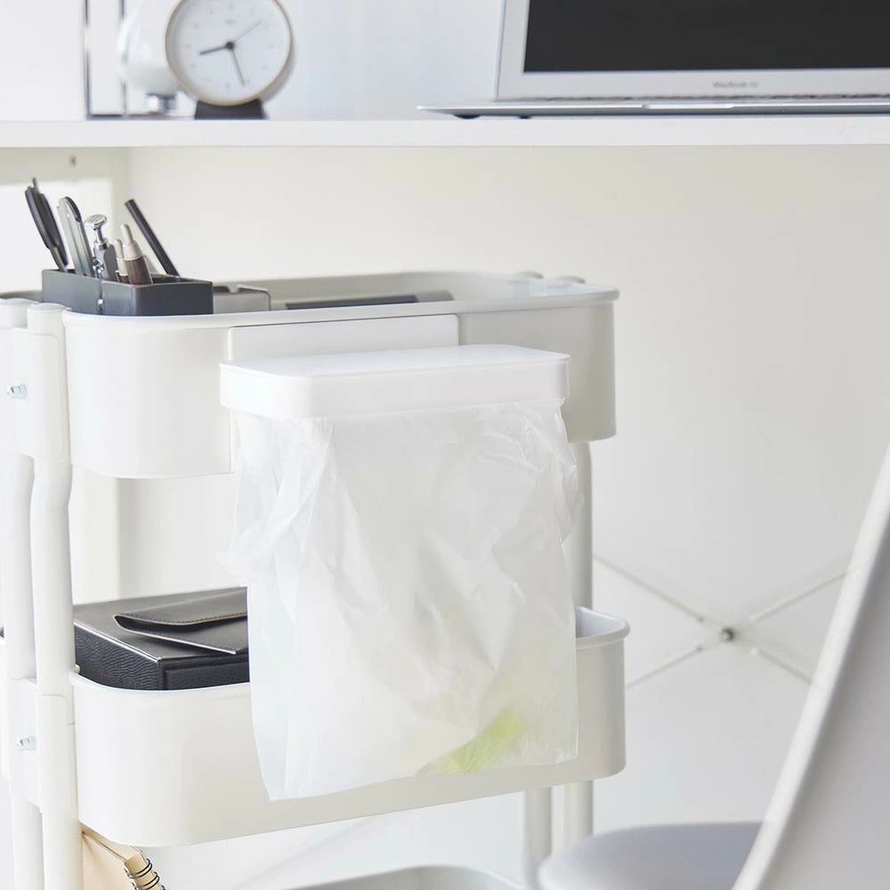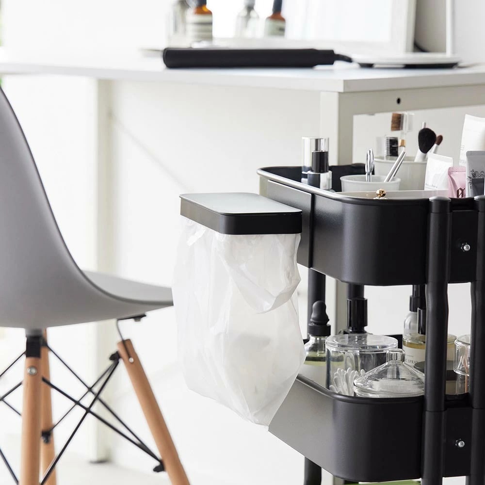 マグネットでペタッと簡単に設置できる蓋付きポリ袋ホルダーは、ポリ袋を掛けて蓋をはめ込むだけで簡易ゴミ箱になる優れもの!蓋付きなので捨てたゴミが上から見えず見た目にもスッキリ。蓋は片手でサッと開閉できて便利です。マグネットがつく面ならどこでも設置できるので、使いやすい場所に手軽にゴミ箱を増設できます。コスメ用品やペット用品の収納にスチールワゴンを使っている方なら、メイク中に出たゴミも、ペットのグルーミング中に出たゴミも、気軽にその場で捨てられます。冷蔵庫横に設置するのもおすすめです。