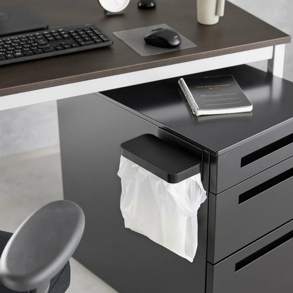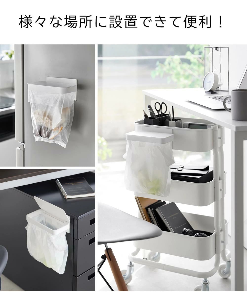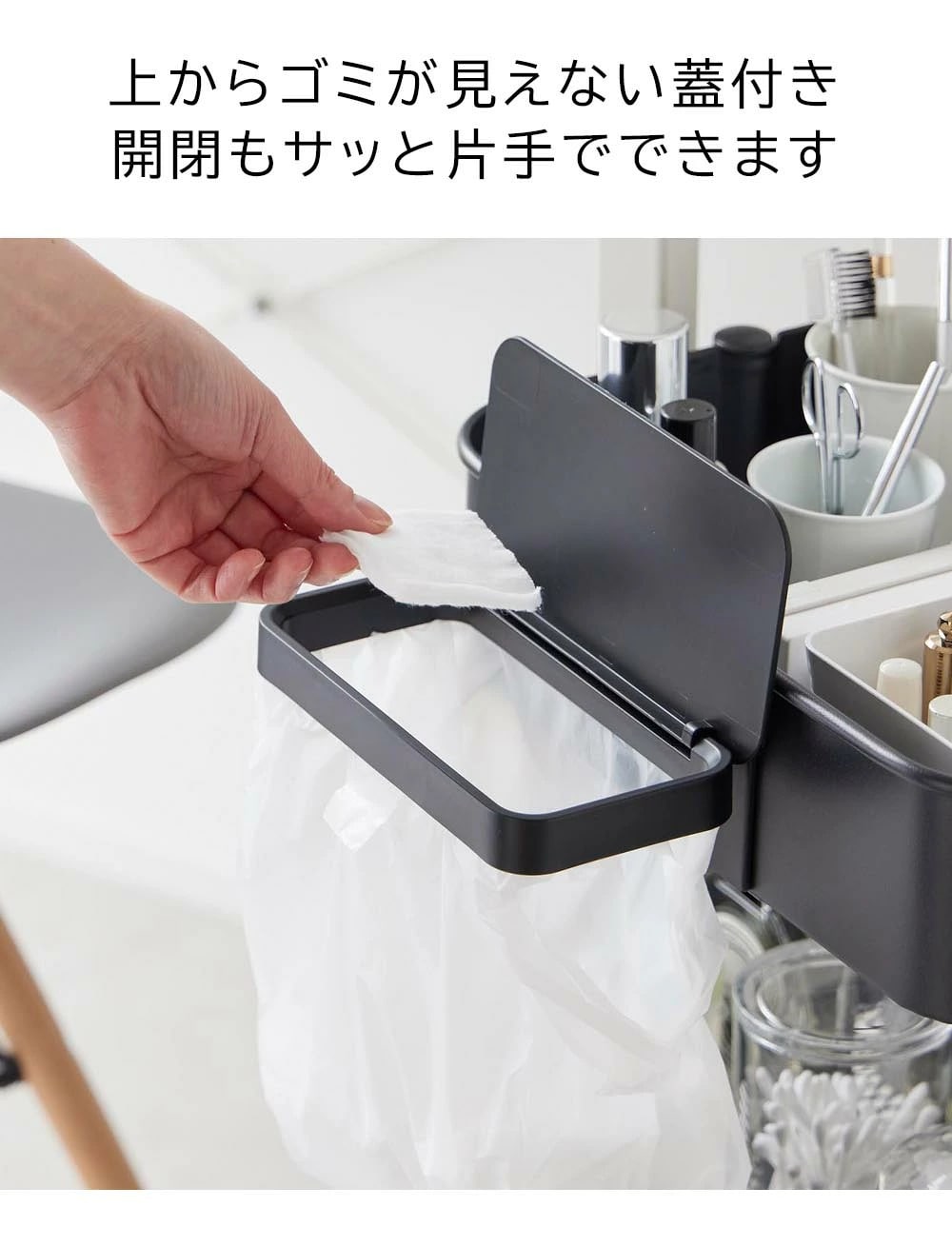 マグネットでペタッと簡単に設置できる蓋付きポリ袋ホルダーは、ポリ袋を掛けて蓋をはめ込むだけで簡易ゴミ箱になる優れもの!蓋付きなので捨てたゴミが上から見えず見た目にもスッキリ。蓋は片手でサッと開閉できて便利です。マグネットがつく面ならどこでも設置できるので、使いやすい場所に手軽にゴミ箱を増設できます。コスメ用品やペット用品の収納にスチールワゴンを使っている方なら、メイク中に出たゴミも、ペットのグルーミング中に出たゴミも、気軽にその場で捨てられます。冷蔵庫横に設置するのもおすすめです。