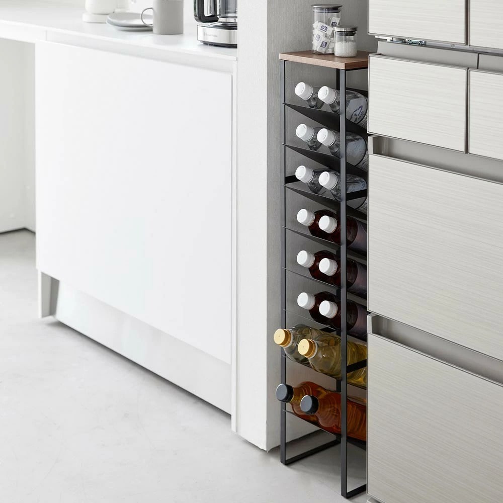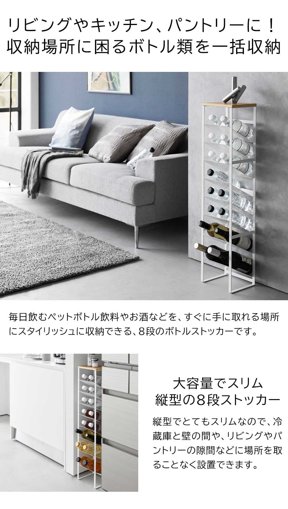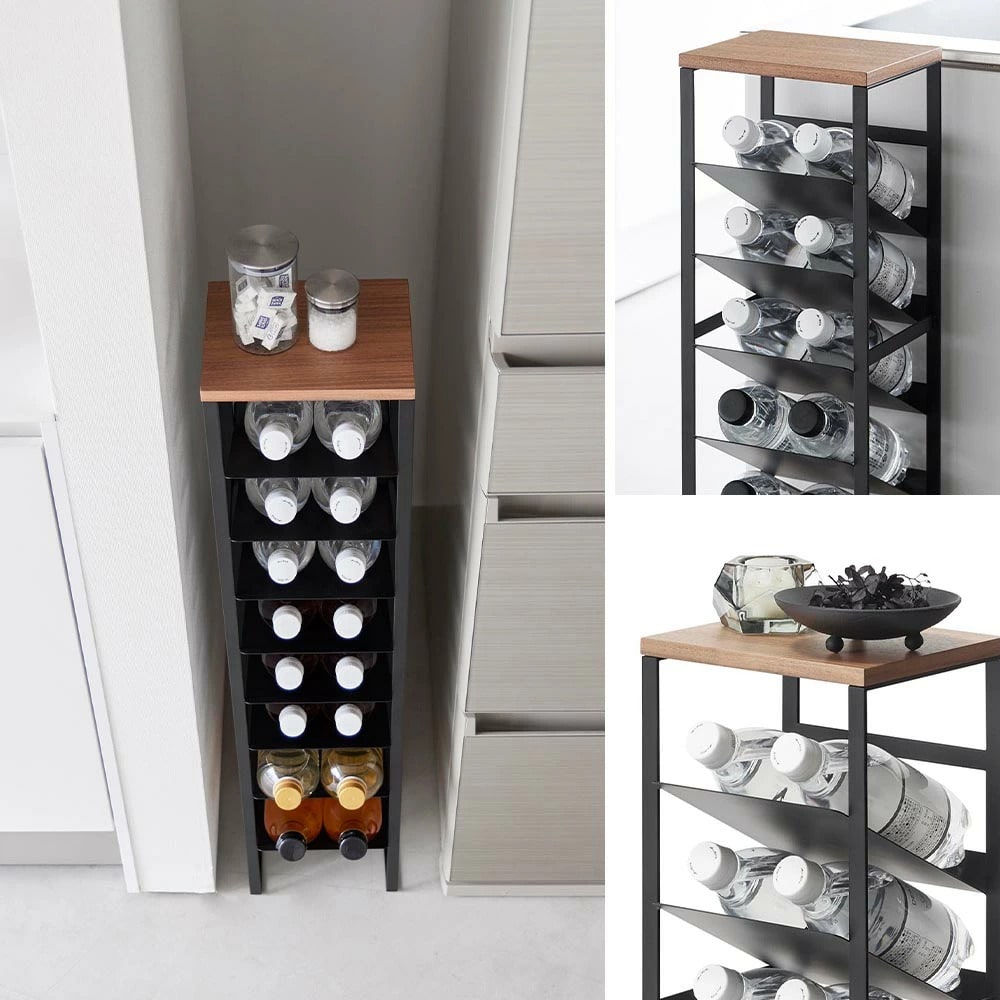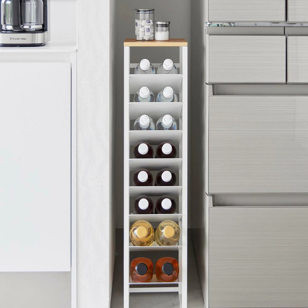 毎日飲むペットボトル飲料やお酒などを、すぐに手に取れる場所にスタイリッシュに収納できる、8段のボトルストッカーです。 縦長のとてもスリムなストッカーなので、冷蔵庫と壁の間や、リビングやパントリーのちょっとしたスペースに場所を取ることなく設置できます。 傾斜の付いた棚はボトルを引き出しやすく、安定して収納できるデザイン。ボトルを最大16本収納可能です。 上の6段は、500mLのペットボトルや、キッチンのラップやホイルなどの小物類の収納にぴったり。下の2段はやや高さにゆとりがあり、大きめのボトルや瓶類、調味料ボトルなどの収納に最適です。 天然木の天板には小物を置くことができます。